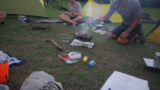 寝床の確保がひと段落すると、輪になっての飲み食い談笑が始まる。この季節の焚き火の役割は主に照明と虫除け、そして場の中心をつくること。