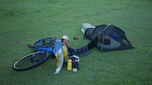 今回の自分のシェルター。2.8×2.8メートルの軽量タープを折り返し、自転車を支柱にして屋根をかけた。後で気づいたのだが、シートポストを伸ばせばもっと居住性は上がる。蚊帳は必須。