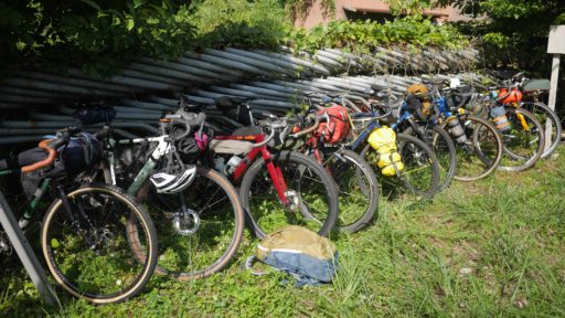 参加者たちの自転車。ホイール規格は700Cが最多、次いで650B、一人は26インチ。みな積載はコンパクトで、大型サドルバッグ使用率は低い。