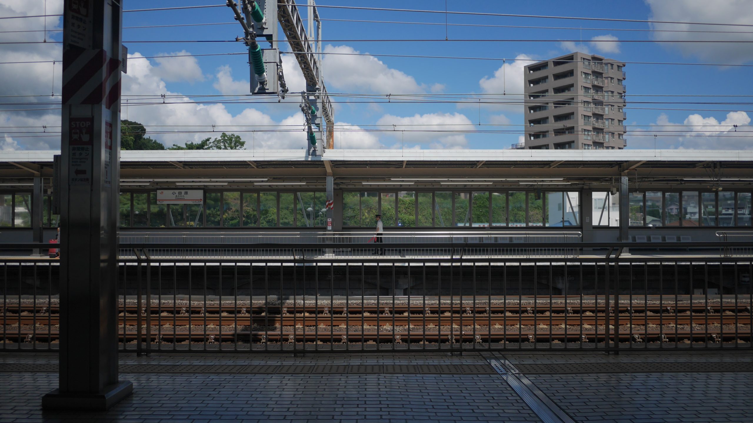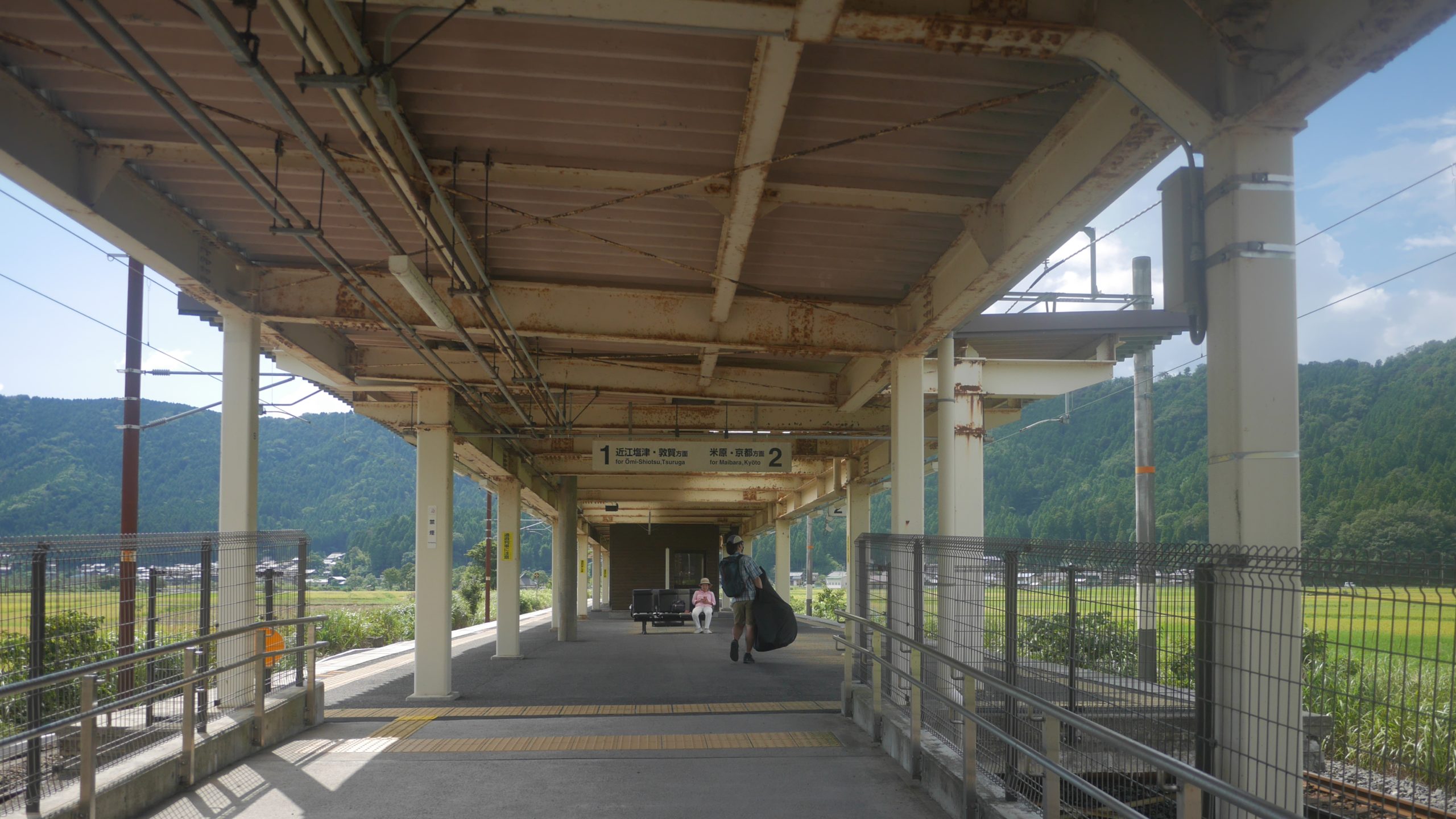 余呉駅から二人は輪行。雲が湧き、山からゴロゴロ音がする。昼下がりは流石に蒸し暑く、駅舎の待合所よりプラットフォームの方が涼しかった。