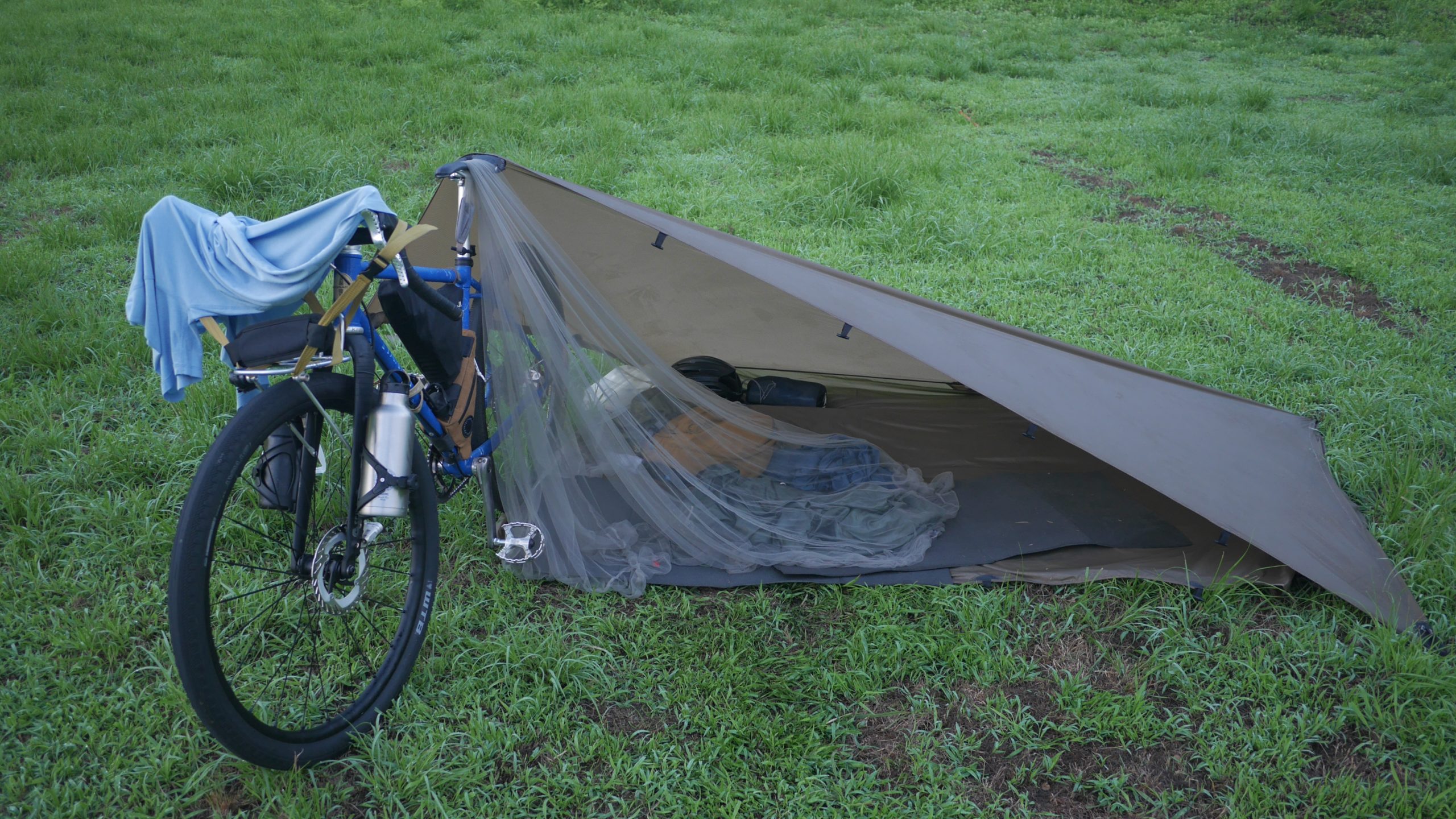 今回の自分のシェルター。2.8×2.8メートルの軽量タープを折り返し、自転車を支柱にして屋根をかけた。後で気づいたのだが、シートポストを伸ばせばもっと居住性は上がる。蚊帳は必須。