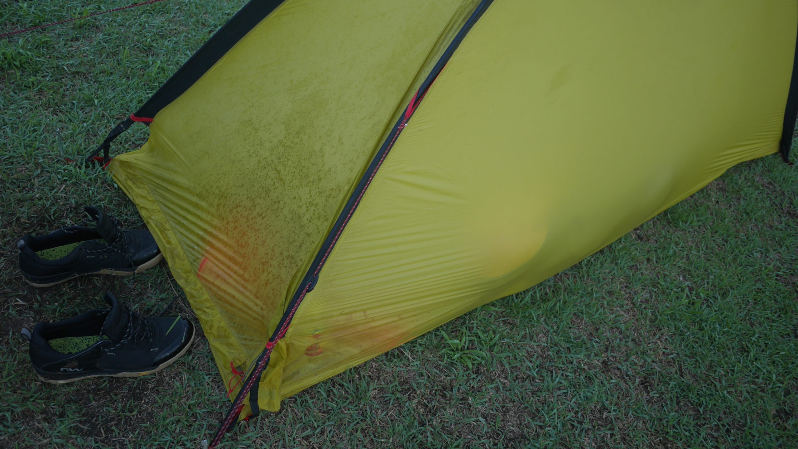 ミニマルなシングルウォールシェルターを用いたケース。閉鎖空間を確保できるメリットは大きいが、結露が凄い。赤いガイラインの視認性がとても低く、参加者のほぼ全員を躓かせて不評を買っていた。