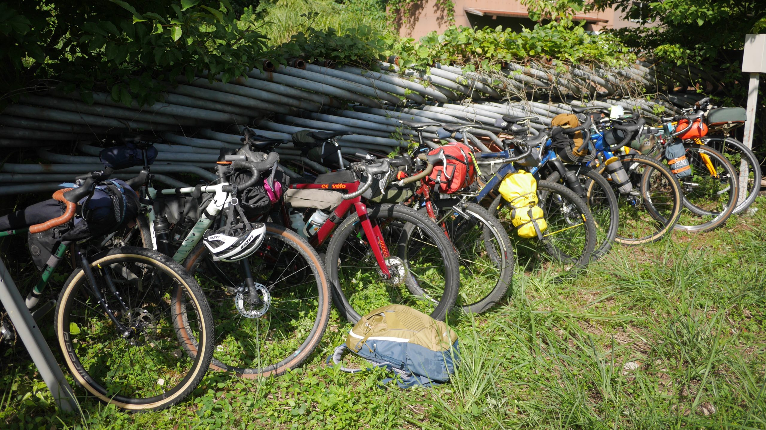 参加者たちの自転車。ホイール規格は700Cが最多、次いで650B、一人は26インチ。みな積載はコンパクトで、大型サドルバッグ使用率は低い。