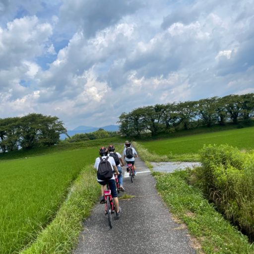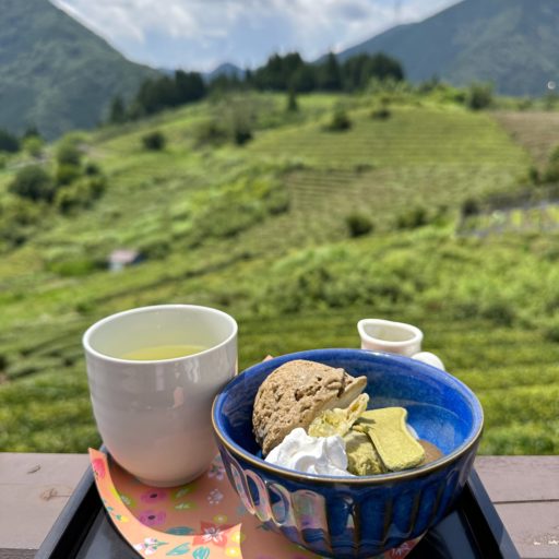 市街地を抜けるとすぐに田園が広がった。白鷺が稲の中に留まり、梅雨の間の束の間の快晴を楽しんでいるように見えた。道が傾き始めてすぐの場所に湧水を飲める場所があり、迫る坂道へ向けて体力を整えた。傾斜の度合いが上がるにつれて電動アシストの力が効いてくる。自分の足で自転車を漕いでいるのか、電気が自転車を漕いでいるのか、激しい斜面を前にして定かではなくなってくる。バスの停留所が道端から姿を消して、しばらく進んだ先にあった茶屋で一服をした。店内のテラスからは茶畑を見下ろすことが出来る。