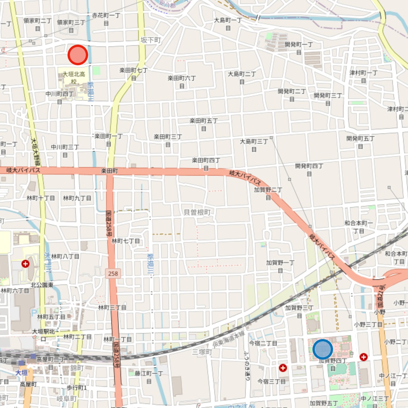 旧校舎(左上、赤丸)と現在のIAMAS(右下、青丸)の位置関係