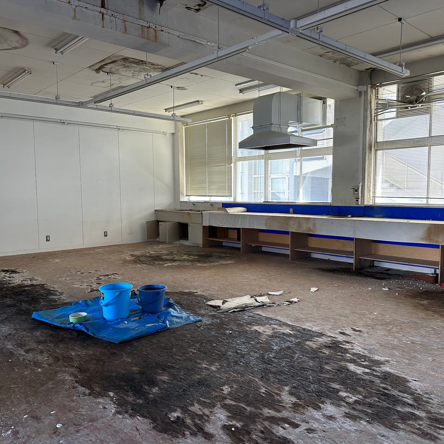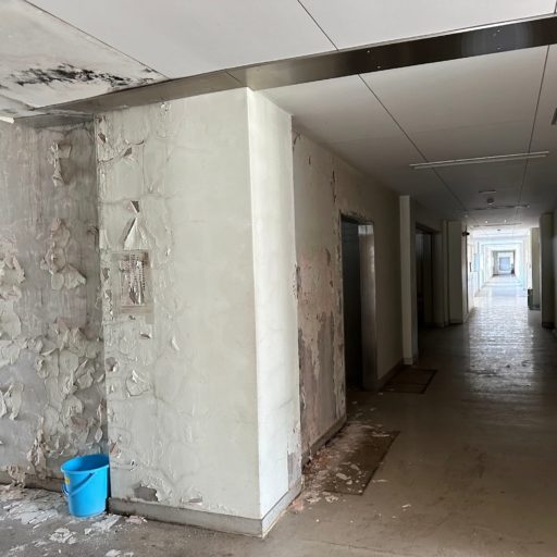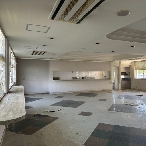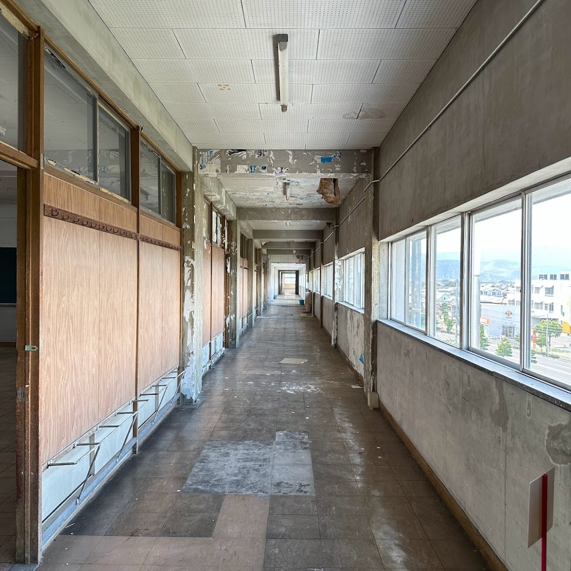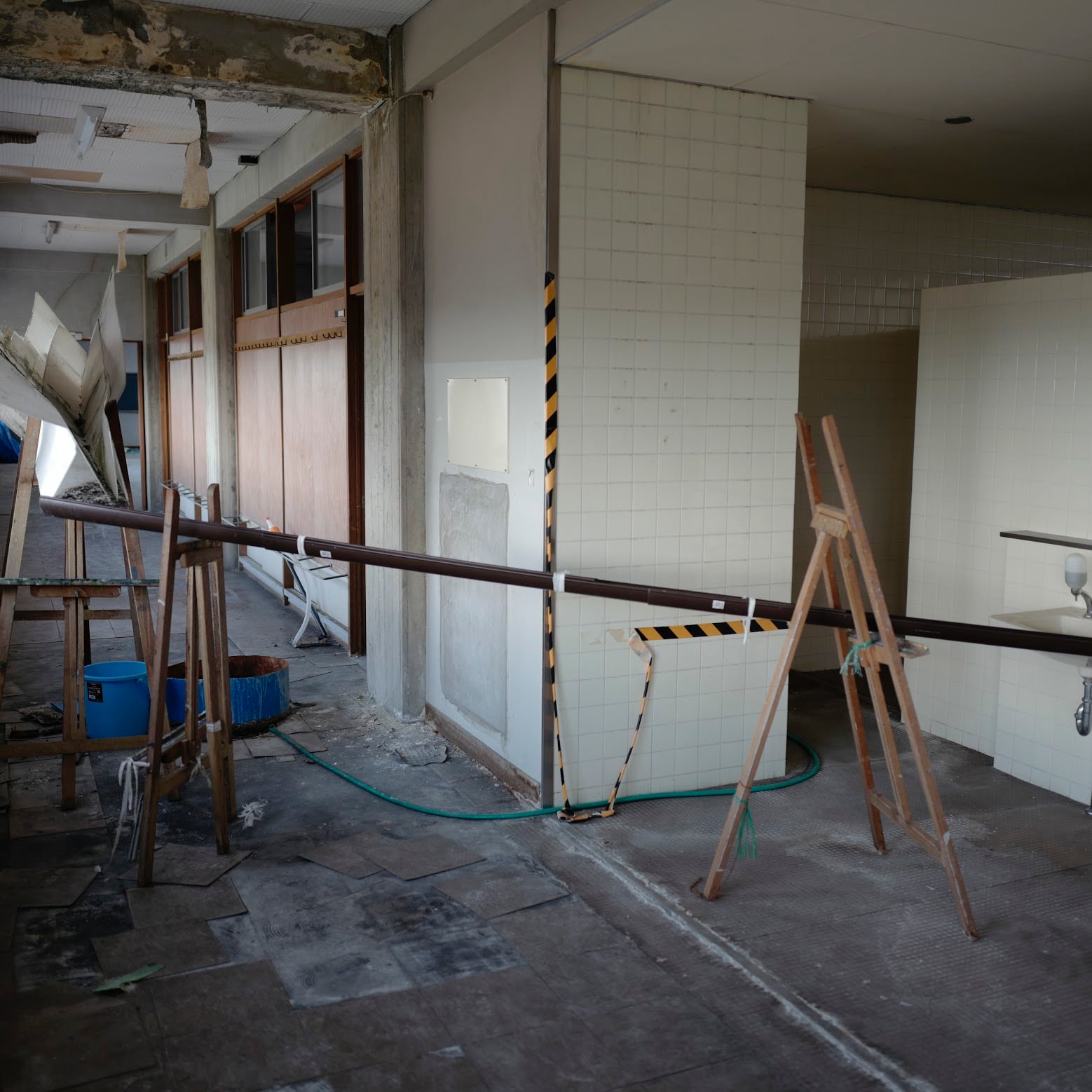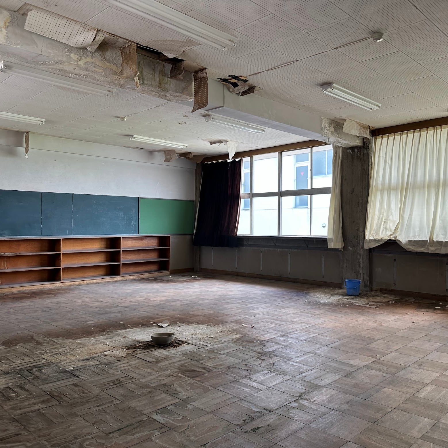 入口から1階に入ると一直線に長い廊下があり、幾つもの部屋がそこに接している情景へと入っていく。私にとっては小学校でよく見た構造である。いくつかの部屋に入ると、床が剥がされた部屋や使われていない厨房がある部屋などがあり、”使われずに経年劣化した場所”というイメージが入り込んできた。そして廊下を歩いていると一緒に探索していたプロジェクトメンバーがおそらく放送室の装置を使って校内に’遊び’の放送を流すのが聞こえてきた。”イタズラ冒険”の始まりといった感じである。