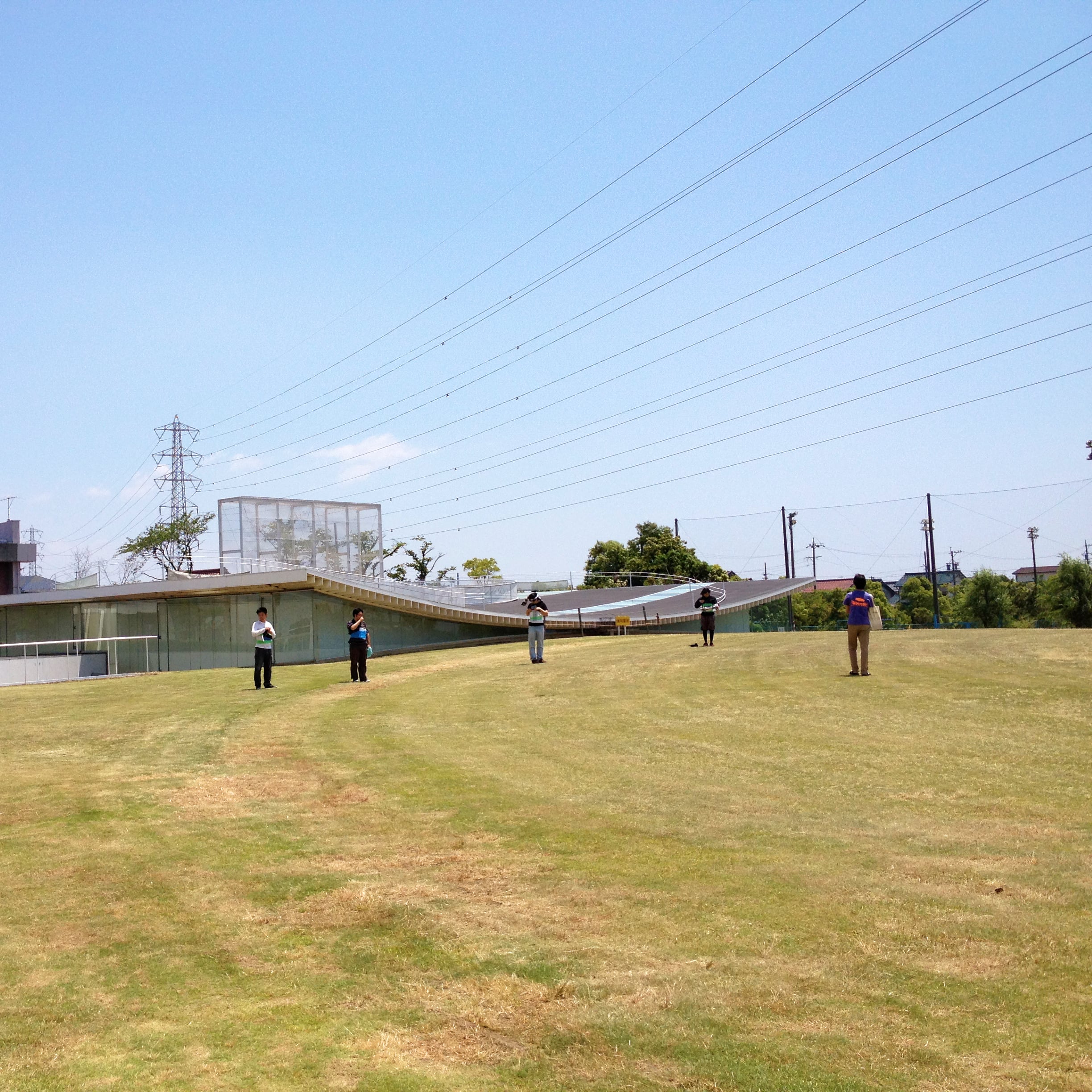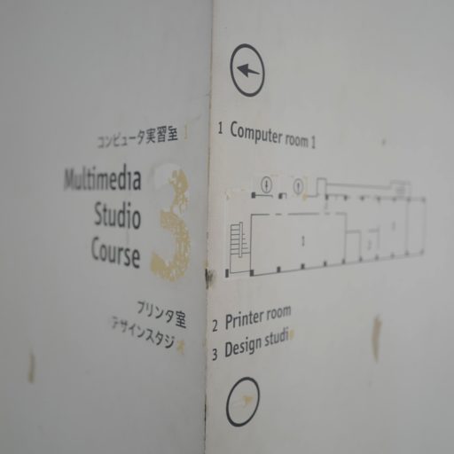 マルチメディア工房は中に様々な環境のギャラリーが用意された建物であったが、まず入る場所を見つけ出すのが難しかった。半地下の通路から建物内に入る経路が一番デザインされたものであるように見えたが施錠管理の影響でその通路が使えない。初めて来たプロジェクトメンバー皆で模索した結果、グラウンドの草むらをかき分けていくと工房の屋根にそのまま登れることを発見した。グラウンドの高さと屋根の高さは脚を軽く上げれば難なく渡れるものだったので、設計の時点で意図された経路なのだと思う。しかし、草むらからいきなり屋根に登るという行為自体が日常の価値観から逸脱させるものであり、心に遊びをもたらす影響が仕組まれているなぁと感じた。