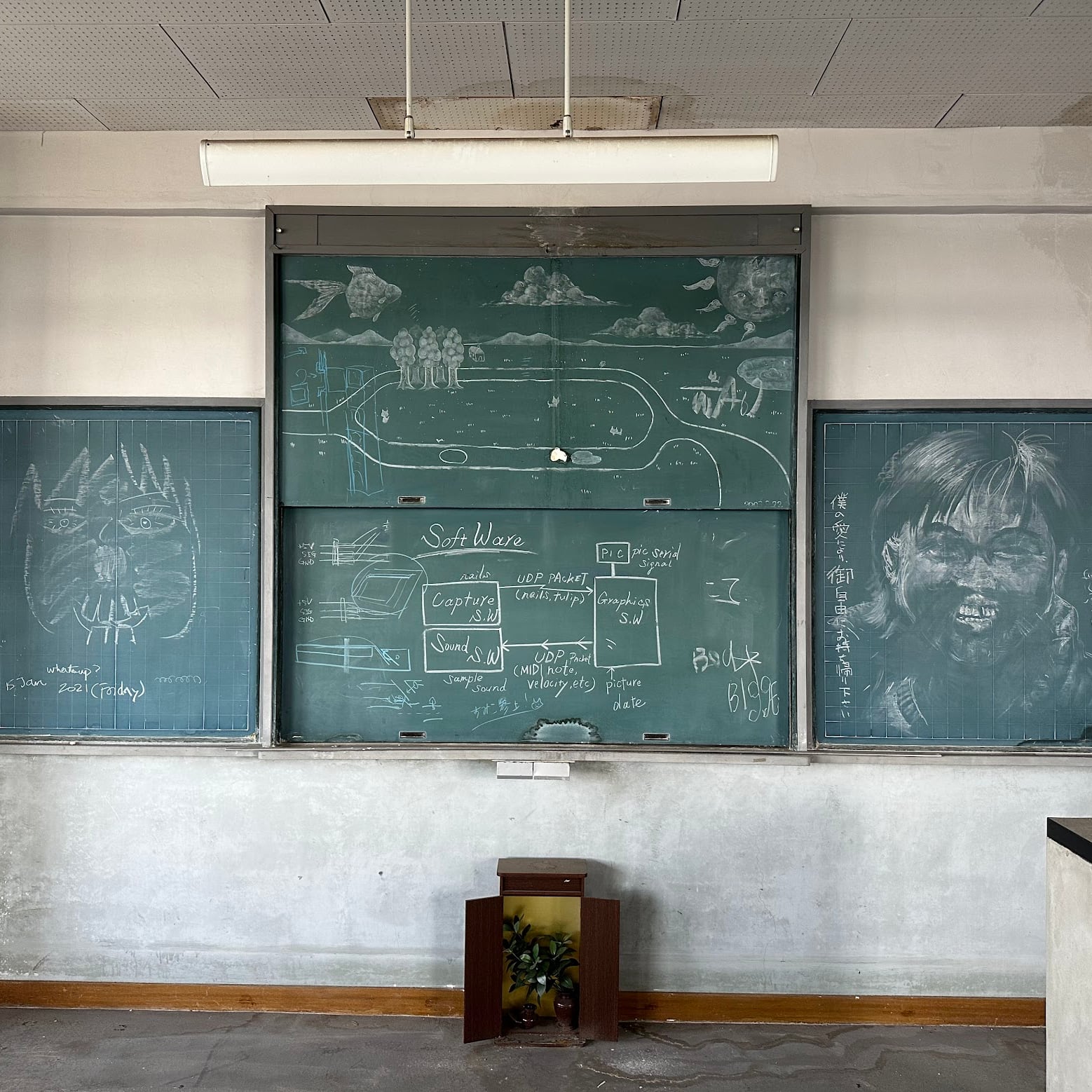 今回の旧校舎の訪問・探索は自分達の学生生活・価値観にとって少なくない影響を持つ物であった。昔自分が持っていた子供時代の遊び心が誘起され、いくらでも落書きできる黒板がそこら中に広がり、窓からは変わり続ける田畑や山々が広く見渡せる。屋上で登ってボーッとすればそれだけで世界は大きく広がるだろう。そのような場所に、そこで学ぶわけでも学べるわけではないけれども、あり得たかもしれない場所として、自分と関係を感じてしまうような場所として訪れた現IAMAS生にとっては自分の学生生活をその空間にARのように照らし合わせて想像せずにはいられなかった。