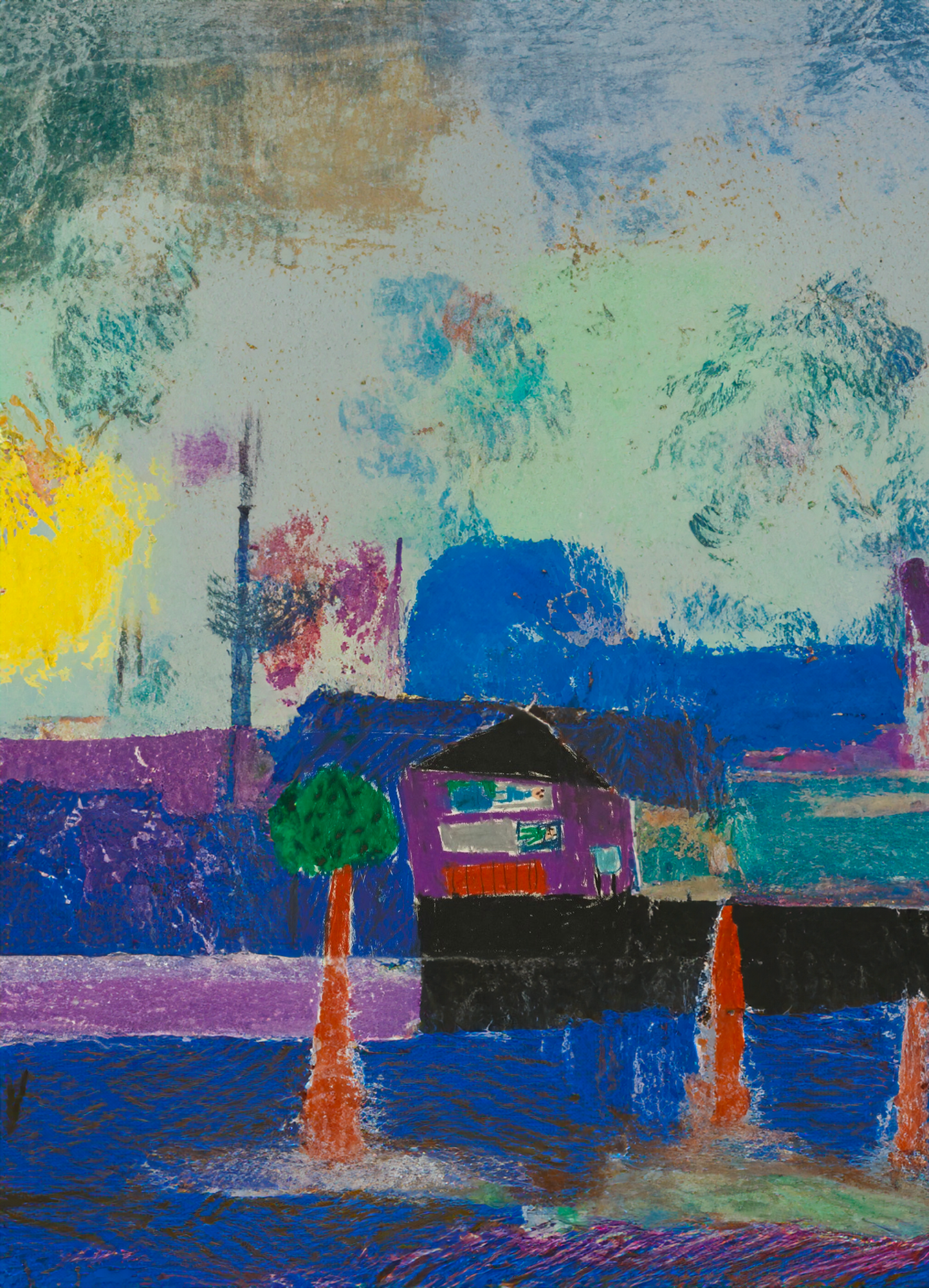 こちらも前述の生成手法を用いて幼少期に描かれた部分(木と家)から、周辺を描き足してみる。(作家本人の許可をとっていないため、問題があれば取り下げる予定)