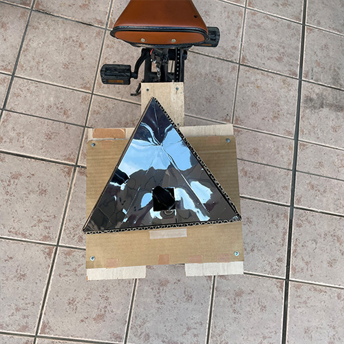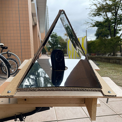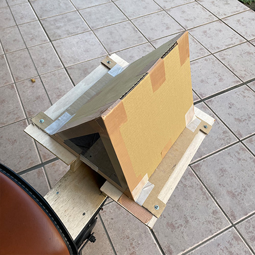 視界全体に風景が模様として広がる表現にするために、3ミラーシステムを採用。アクリル板にミラーシートを貼り付け、段ボールで補強して作成した。上図のテレイドスコープは先端にレンズが取り付けられているが大きなレンズを用意できなかったので無しで撮影した。