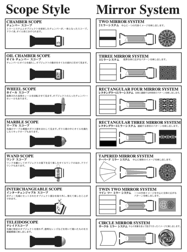 万華鏡にはいくつかの種類がある。一般的な万華鏡は覗き込んだ筒の先端に魅力的な視覚効果を生むオブジェクトが密封された「チェンバー」を備えている。テレイドスコープはこのようなチェンバーがなく、覗き込んだ風景を直接万華鏡の模様へと変換する。