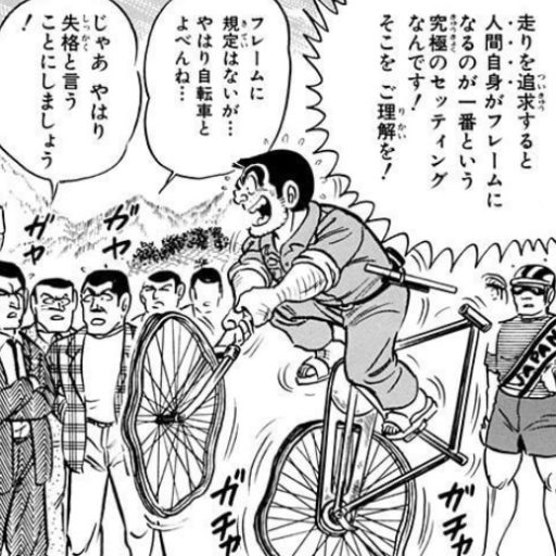 両津の「人間フレーム」というアイデアは、単なるギャグに終わらない話である。”人間フレーム”という言葉通り、人間を一つの構造体とみなすアプローチが重要であると考えられる。自転車を考えることは、人間と自転車という二つの構造体を組み合わせ、どのような一つの力学的システムを形成するのかという角度から考えるのが本質だと思っている。