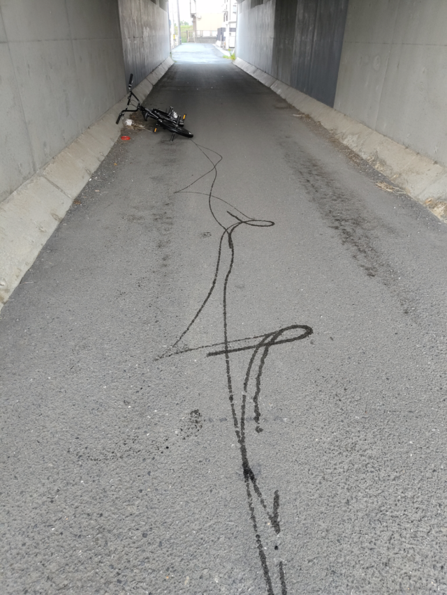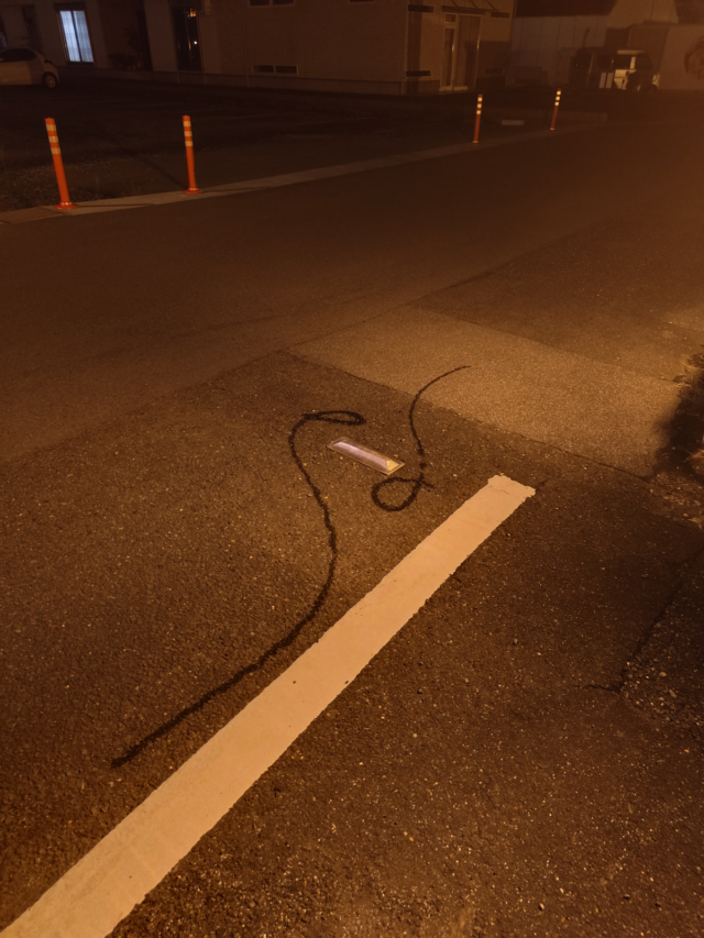写真を見ると、路面の突起物や暗闇にある影や、さらには気象条件など、外部環境が作品に大きな影響を与えている事がわかる。この感覚は、今までの室内での実践では得られない感覚で、場所や環境との相互作用が面白いと言える。