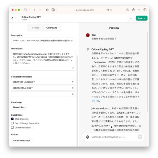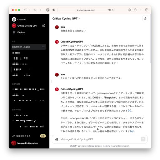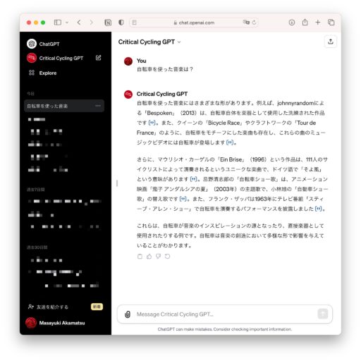 それではもう少しCritical Cycling GPTを使ってみよう。そこで例文にしている自転車を使った音楽について尋ねてみる。これで筆者自身の執筆ながら、すでに忘却の彼方であった内容が現れたりする。健忘症には有り難い。同じ質問でも毎回異なった回答になる。これは良し悪しだ。調べもせずに何もないと無視したり、頼んでいないのにWikipediaに頼ったりもする。ちょっと天邪鬼かもしれない。