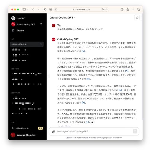 このGPTは単純にクリティカル・サイクリングのWEBサイトを検索して質問に答えているに過ぎない。それでも使い勝手は上々で、まるで専属のコンシェルジュがついたかのように感じられる。記事へのリンクが添えられているので、内容を確認することもできる。多少は辻褄が合わなかったり、十分な内容に至らなかったりするものの、検索範囲が狭いのでハルシネーションは起こりにくいようだ。
