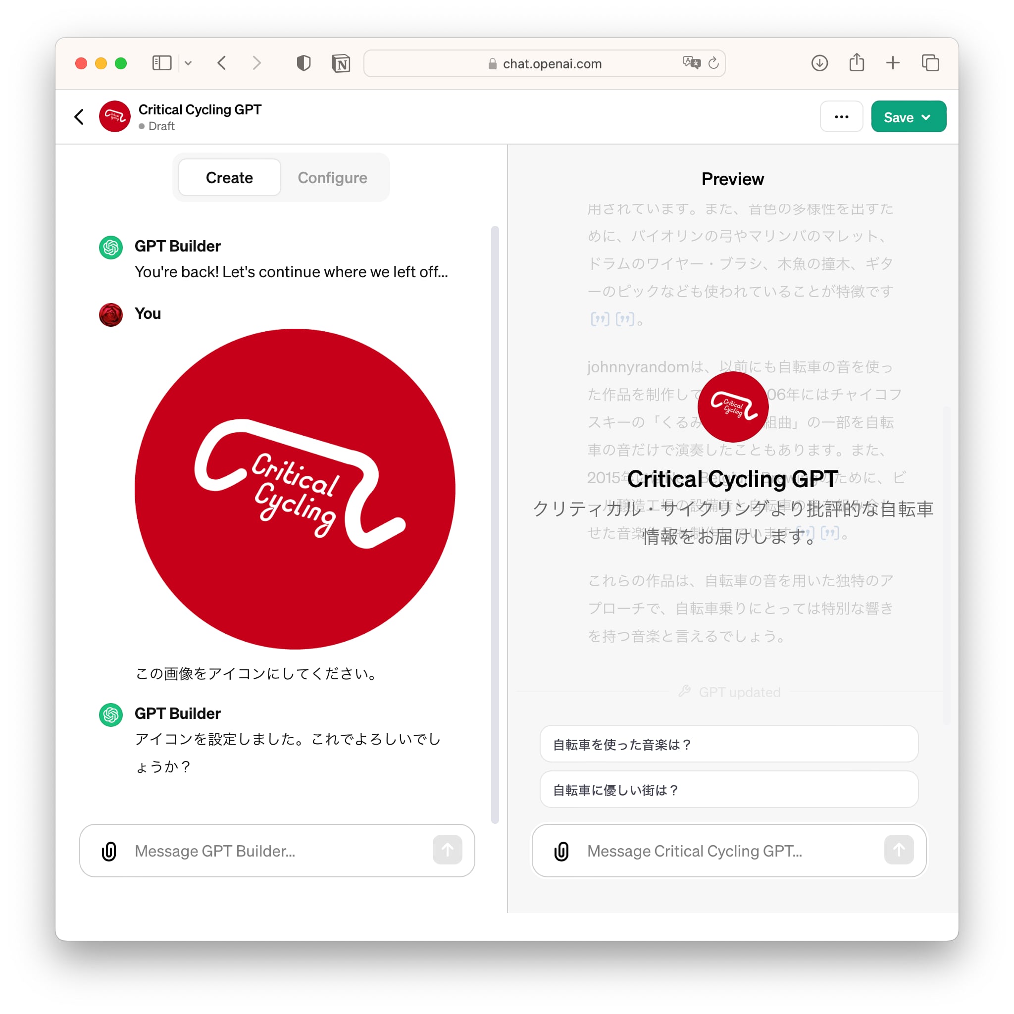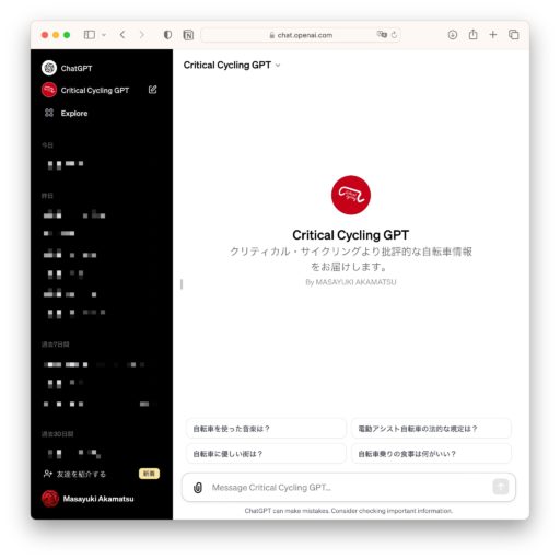 数日前から本サイトのトップ・バー、あるいはメニューに「GPT」という項目が加わっている。これを開くとクリティカル・サイクリング専用のGPT(事前学習済みの生成的トランスフォーマ)が現れる。いわゆるオレ様ChatGPTだ。2023年11月6日(PST)の「OpenAI Dev Day」イベントで発表されたGPTsというサービスを活用しており、現時点ではChatGPT Plusユーザのみが利用できる。
