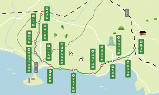 藤沢から鎌倉まで寄り道をせずに江ノ電沿いをサイクリングをすれば1時間少々の距離だが、近隣には江ノ島などの風光明媚な海の風景や、鎌倉大仏を代表とする寺社仏閣があるのでゆっくりと街の風情を味わうことが出来る。道幅が狭い地域もあるが高低差が無く走りやすい。そして何より海風に吹かれながら海岸線をサイクリングするのはとても気持ちが良い体験だ。