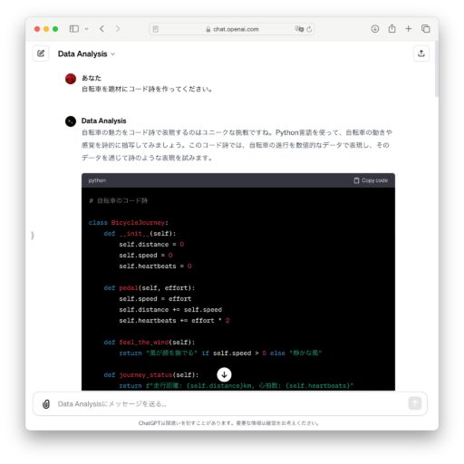 寒い冬の昼下がり、自転車のコード詩を作ろうと思った。普段まったくないことだが、朝から立ちくらみがして、外出を控えていたからだ。普段ではない心身であれば、普段にはない行動をしたくなる、ってこと。とは言え、コード詩が何であり、どのように作るのかは漠然としていた。そこでChatGPTに作ってもらうことにした。困った時のAI頼み。オプションはData Analysisが最適、かもしれない。
