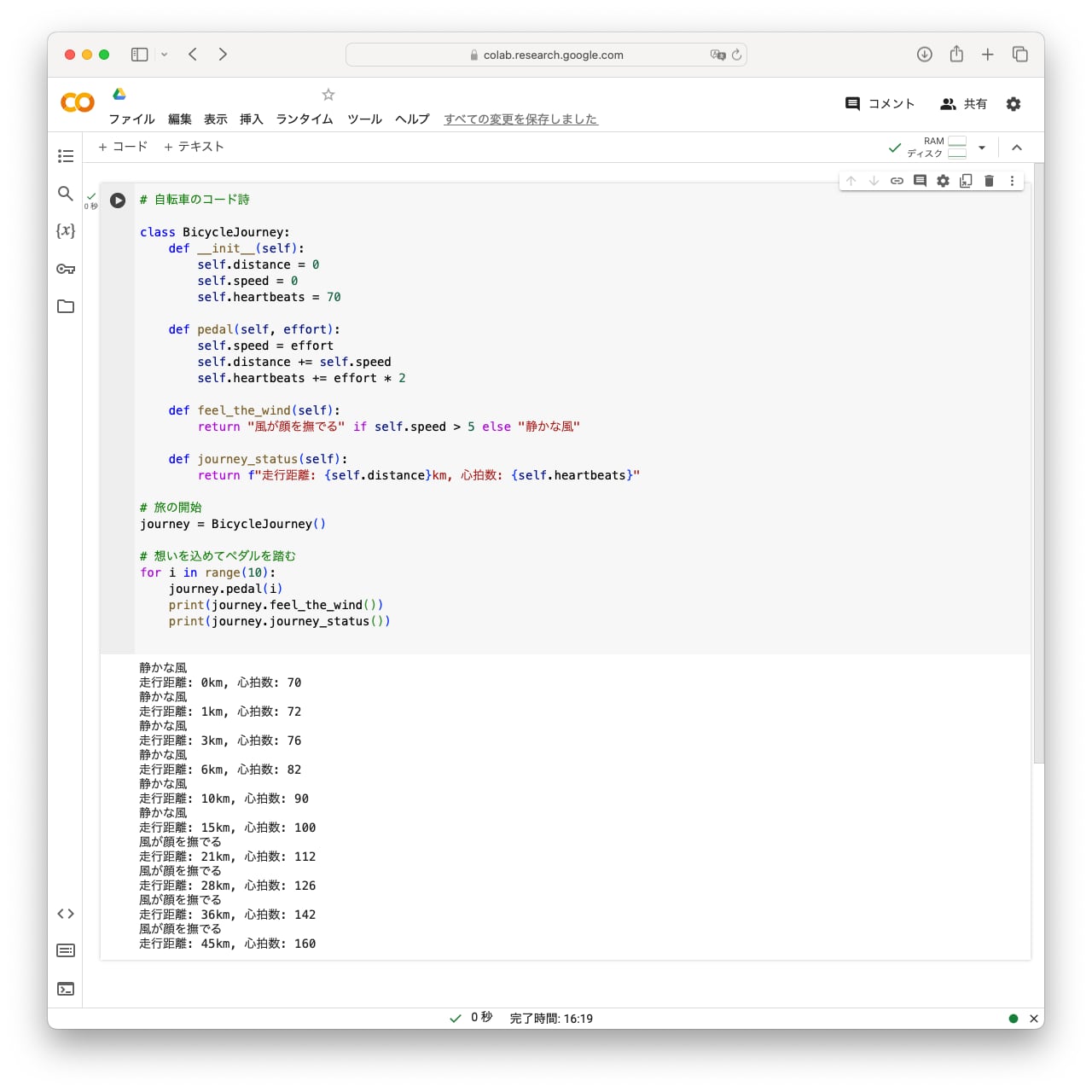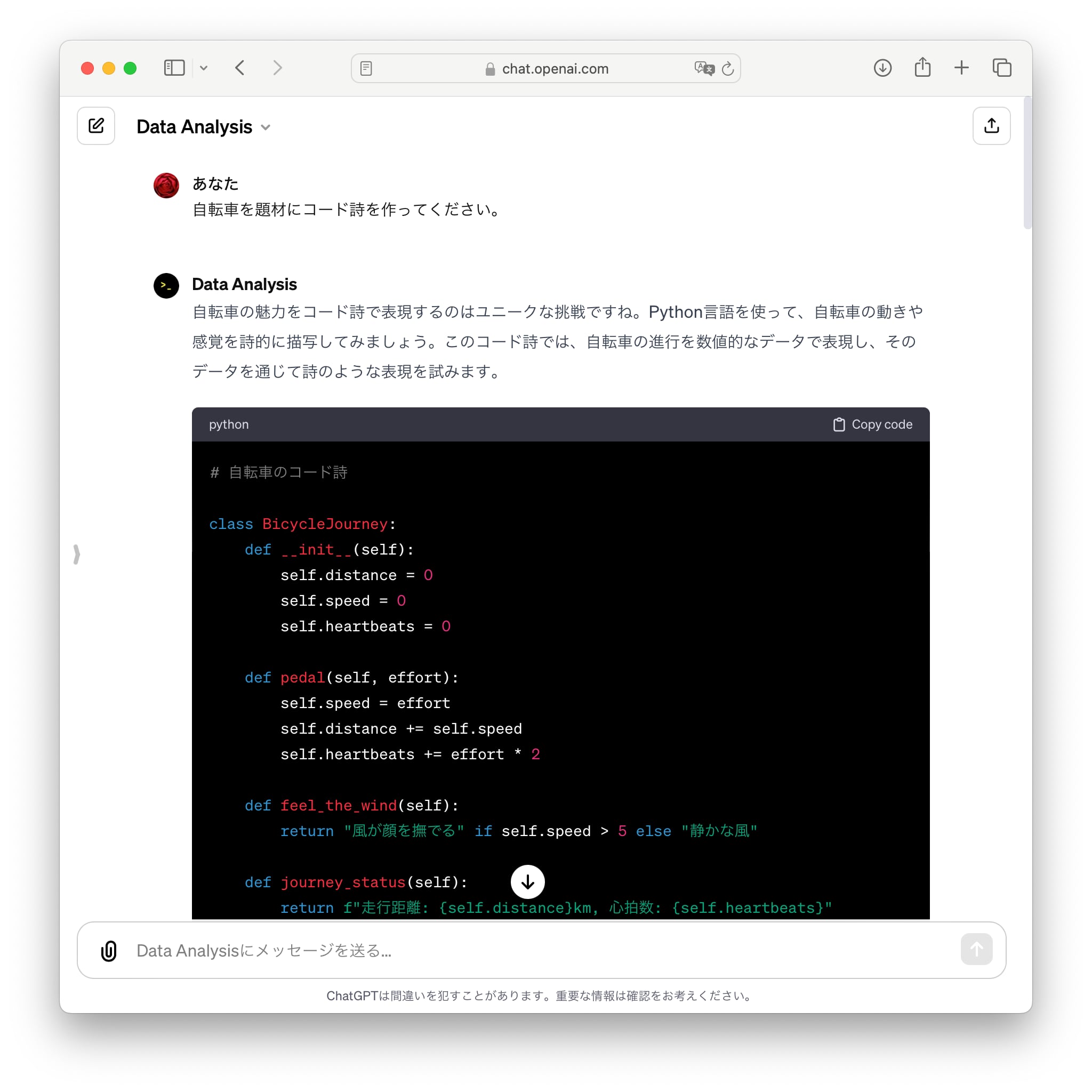 このコード詩では、BicycleJourney クラスを作成して、自転車の旅を模倣しています。ペダルを踏むこと(pedal メソッド)で距離と心拍数が増加し、速度によって風を感じる様子が詩的に表現されています。実行すると、自転車の旅の進行が感じられるでしょう。