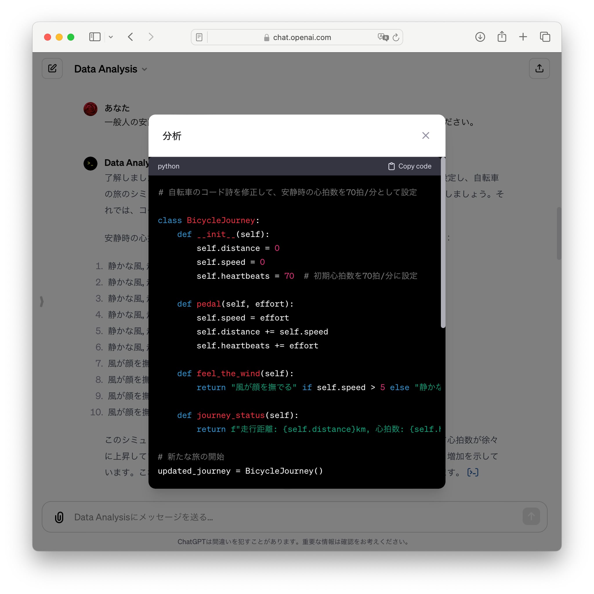ほぼ完璧に思えるものの、走り始めの心拍数が0、2、6、12…と異様に低いことに気が付く。心停止状態で自転車を漕ぎ始められるわけがない。コードを確認するとクラスBicycleJourneyのインストラクタにおいてインスタンス変数heartbeatsの初期値として0が代入されている。正しくは一般的な人の心拍数を設定すべきだろう。これはChatGPTには身体がないと言われる証、かもしれない。