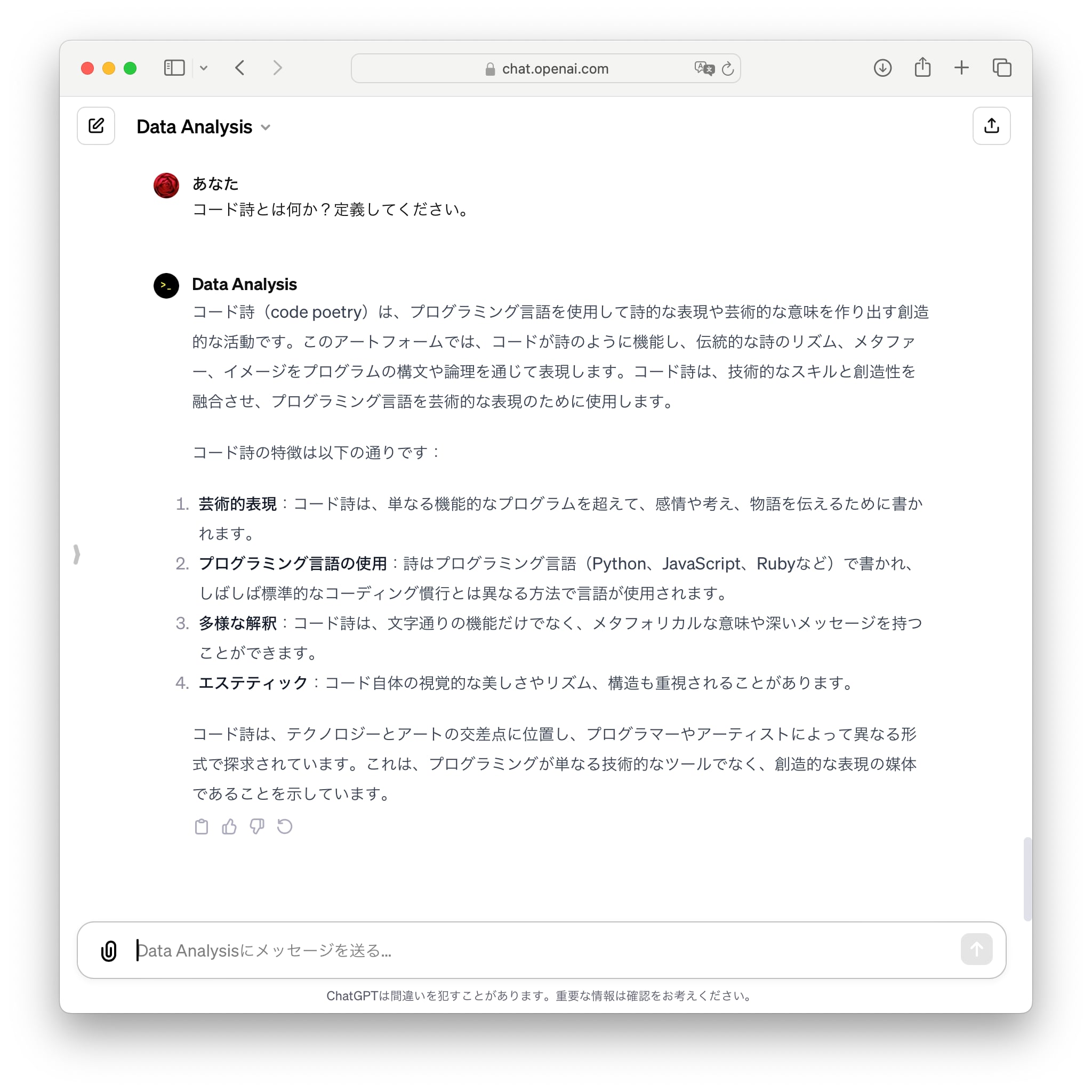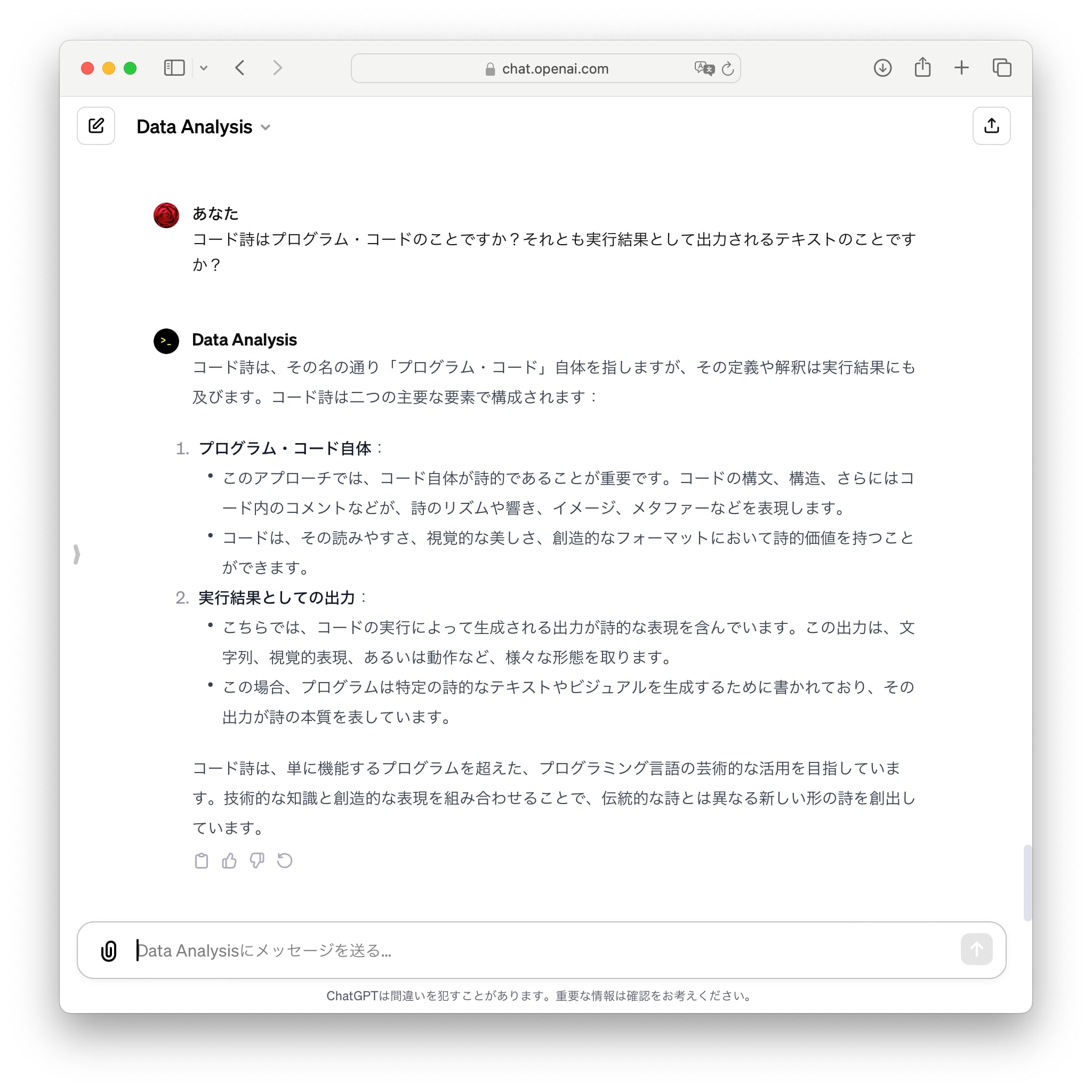 追求はそれくらいにして、最後にコード詩の定義をChatGPTに尋ねておこう。何やら根拠なく自信に満ちているのはいつもの通り。敢えて意訳すれば「コード詩はプログラミング言語を使用して作り出した詩的な表現や芸術的な意味」だろうか。ただし、これではコード詩がプログラム・コードなのか実行結果なのか分からない。しかし、その実体を限定すること自体が無意味、かもしれない。