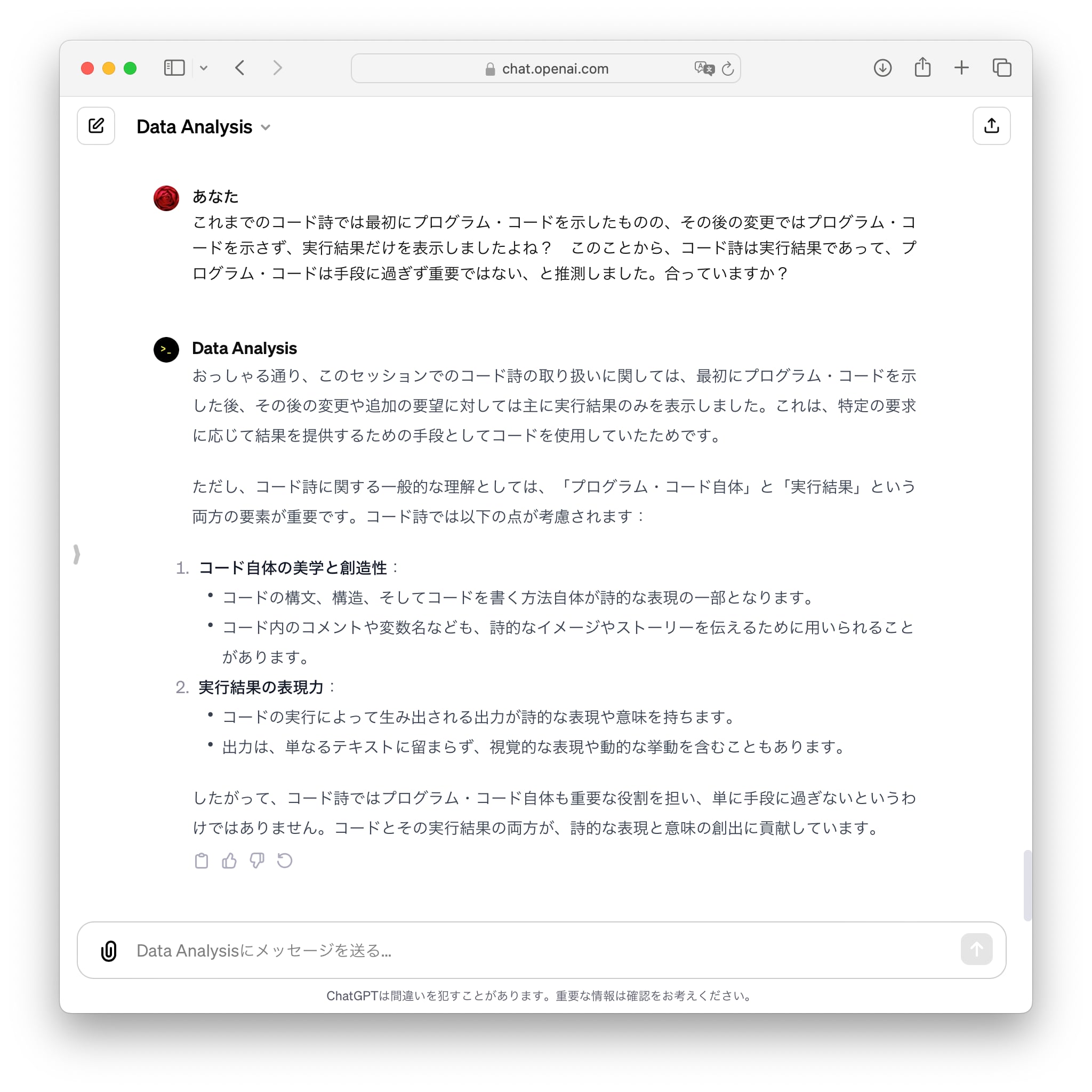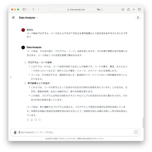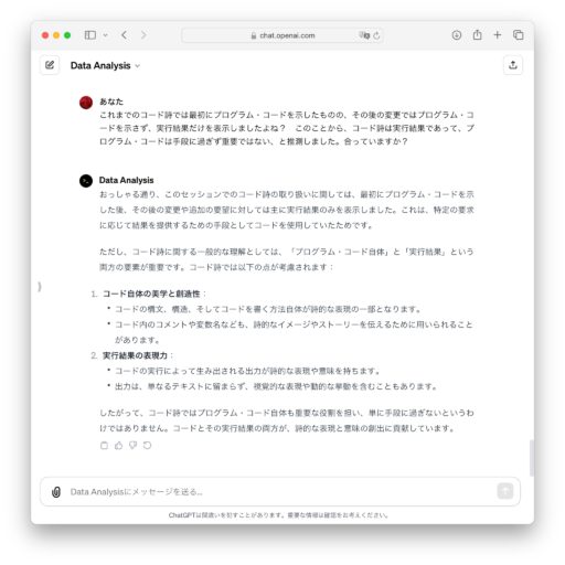 ともあれ、ChatGPTは最初にプログラム・コードを示したものの、それ以降の修正ではコードを示していない。つまり、ChatGPTにとってコード詩とは実行結果であって、コードではないことになる。念のためにChatGPTに尋ねたところ、コード詩とはプログラム・コードと実行結果の両方だと言う。さらに追い討ちをかけても両方だと言って譲らない。妙に筋が通った物言い、かもしれない。