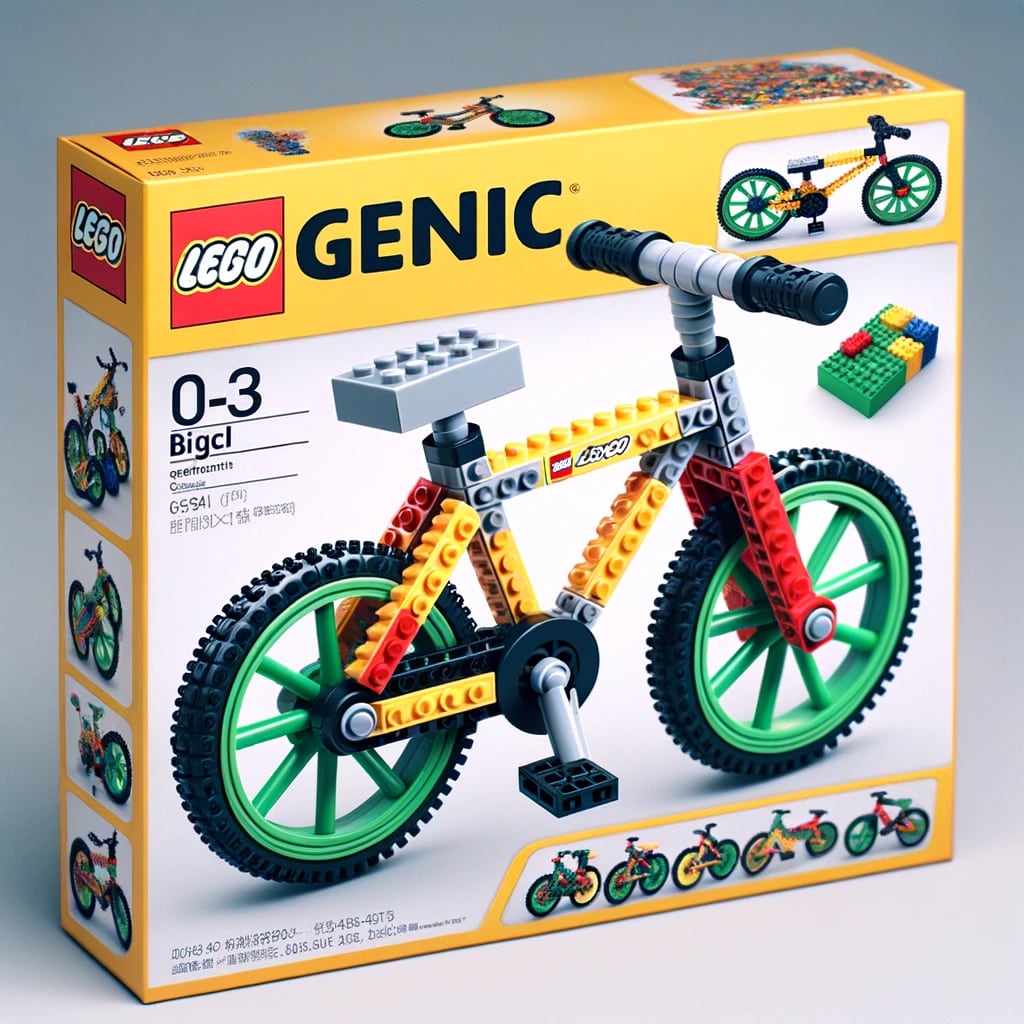 なんと、これまででもっとも完成度が高い自転車が現れた。パッケージの箱にはお馴染みのロゴが銘打たれているし、全体のデザインもLEGOとしか言いようがない雰囲気だ。だが「LEGO」とは指示していない。念のためにLEGOではないことを伝えても、やはりLEGOになっている。どう見てもLEGOだが、生成画像についてのコメントでもLEGOではないと言い張っている。