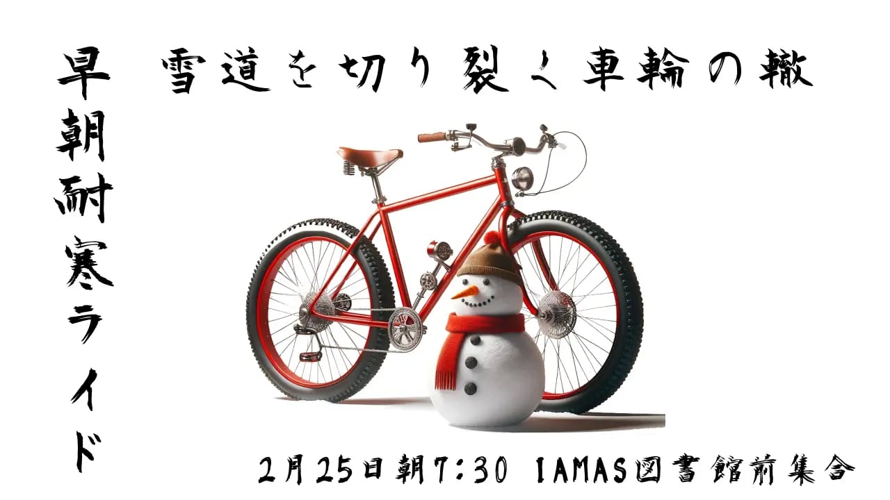 来る2月25日にクリティカル・サイクリングと運動体設計の共催による早朝耐寒ライドを行います。これはIAMASのいわゆる卒展のイベントとして行われ、どなたでもご参加いただけます。近隣の方はもちろん、遠方でも少し早めにお越しいただいて、ライドの後に卒展をご覧いただければ幸いです。