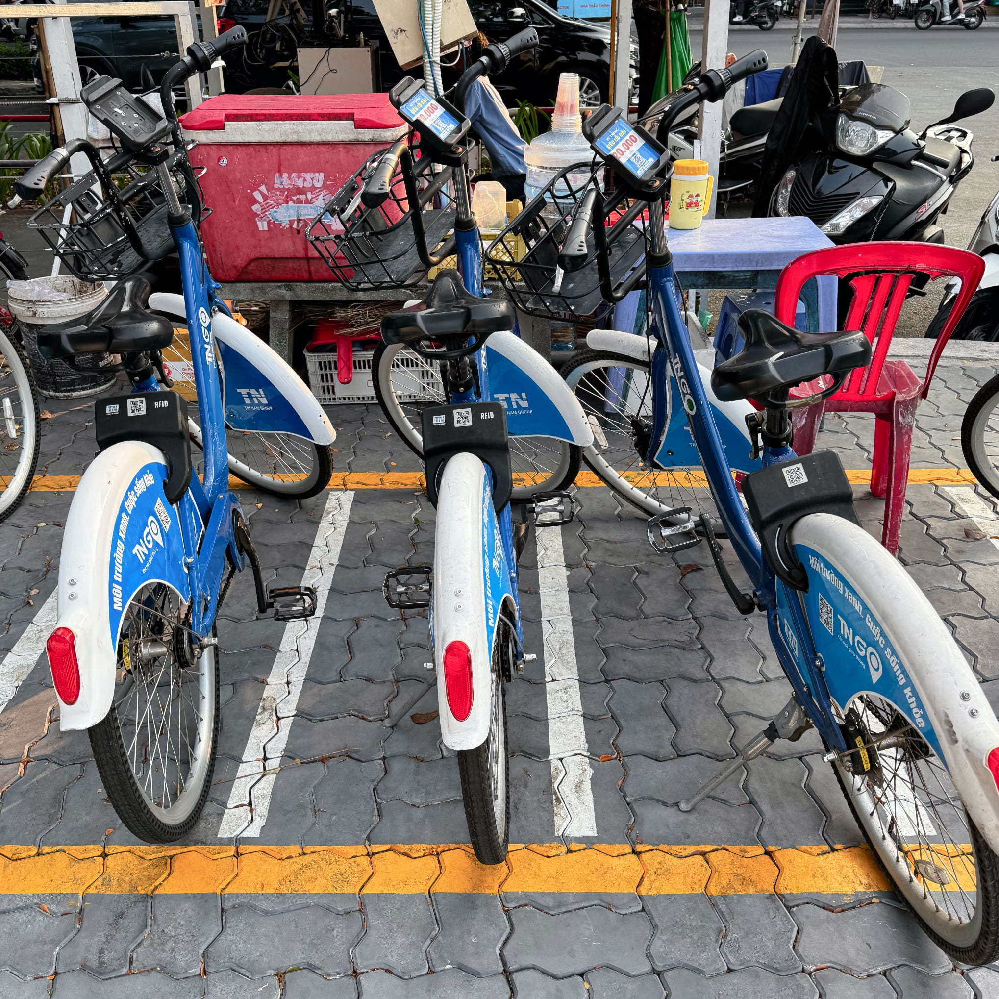 TNGOの自転車は乗り降りしやすいU字型フレームで、小さめの車輪に泥除けを備える。変速機はなく、ブレーキの左右は日本と同じ。サドル下部にシェアリング用のコントローラとロックがあるのも一般的。さらにハンドルの中央にスマートフォンのホルダーがあり、前カゴの底面にソラー・パネルあるのは気が利いている。乗り心地は柔らく悪くない。しかし少なからず整備が悪い自転車があるのは要注意。