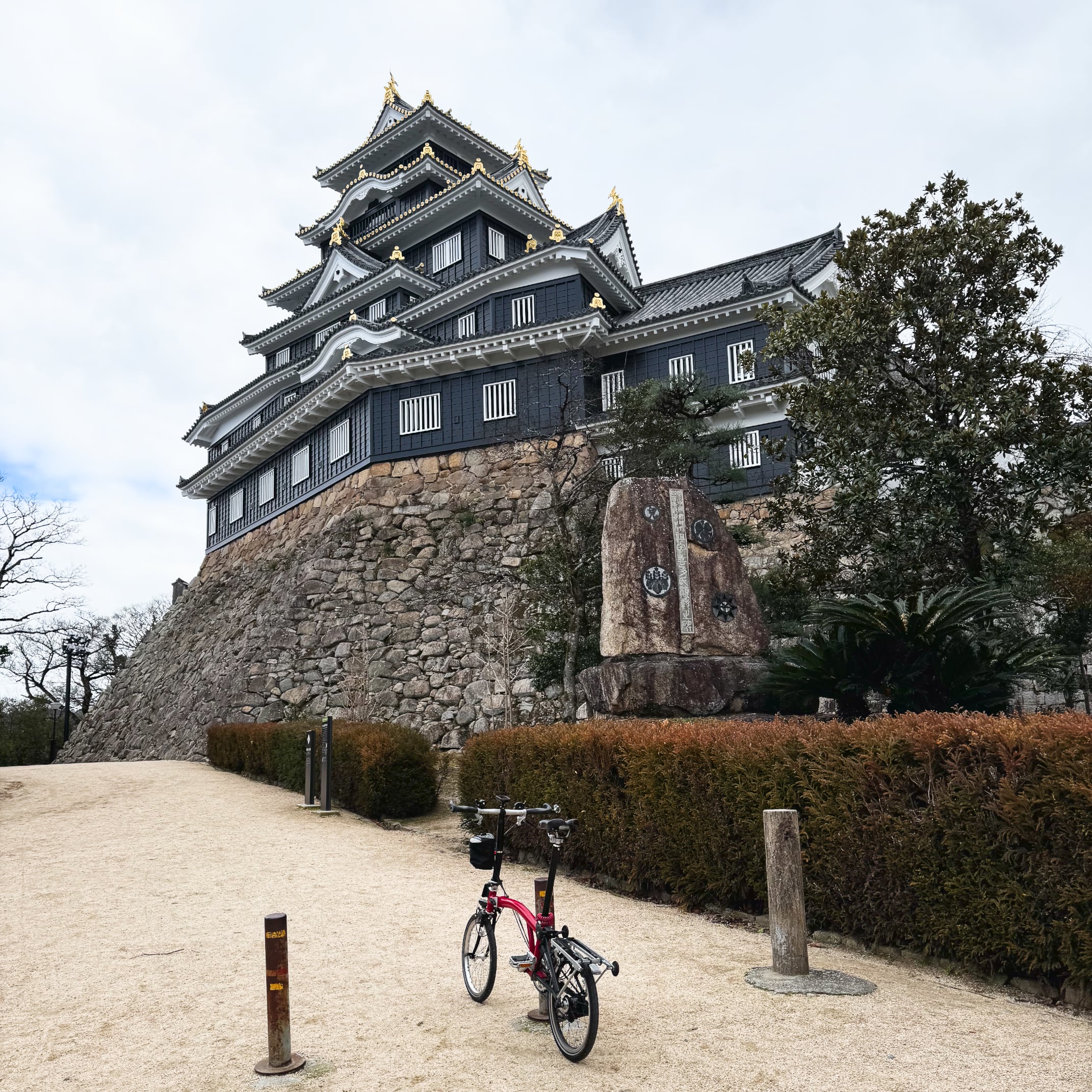前回はレンタル自転車を利用したので、今回はBromptonを輪行で持参。新幹線で岡山まで行き、ランチを兼ねて周辺を走る。Bromptonなら広げるのも畳むのも1分、手軽に乗れるのが良いところ。折り畳んだサイズも小さいので、新幹線の特大荷物置き場には余裕で収まる。ただ岡山から高松に向かう特急マリンライナーには要注意。見晴らしの良い2階席は妙に狭い階段に苦労するからだ。