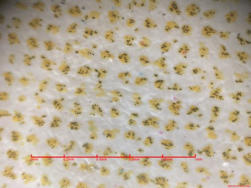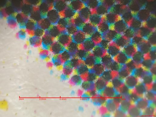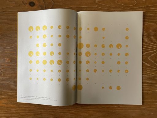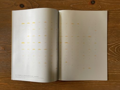印刷仕様では、シルバー(下刷り)+CMYK+ゴールド(上刷り)の6色印刷を試みた。ページを傾けて反射を見たりルーペで確認すると、金や銀の粒子が見え紙面に独特な光沢と質感を与えている。これは一般的なオフセット印刷では得られない、トナー特有の物質感が影響していることを確認できる。