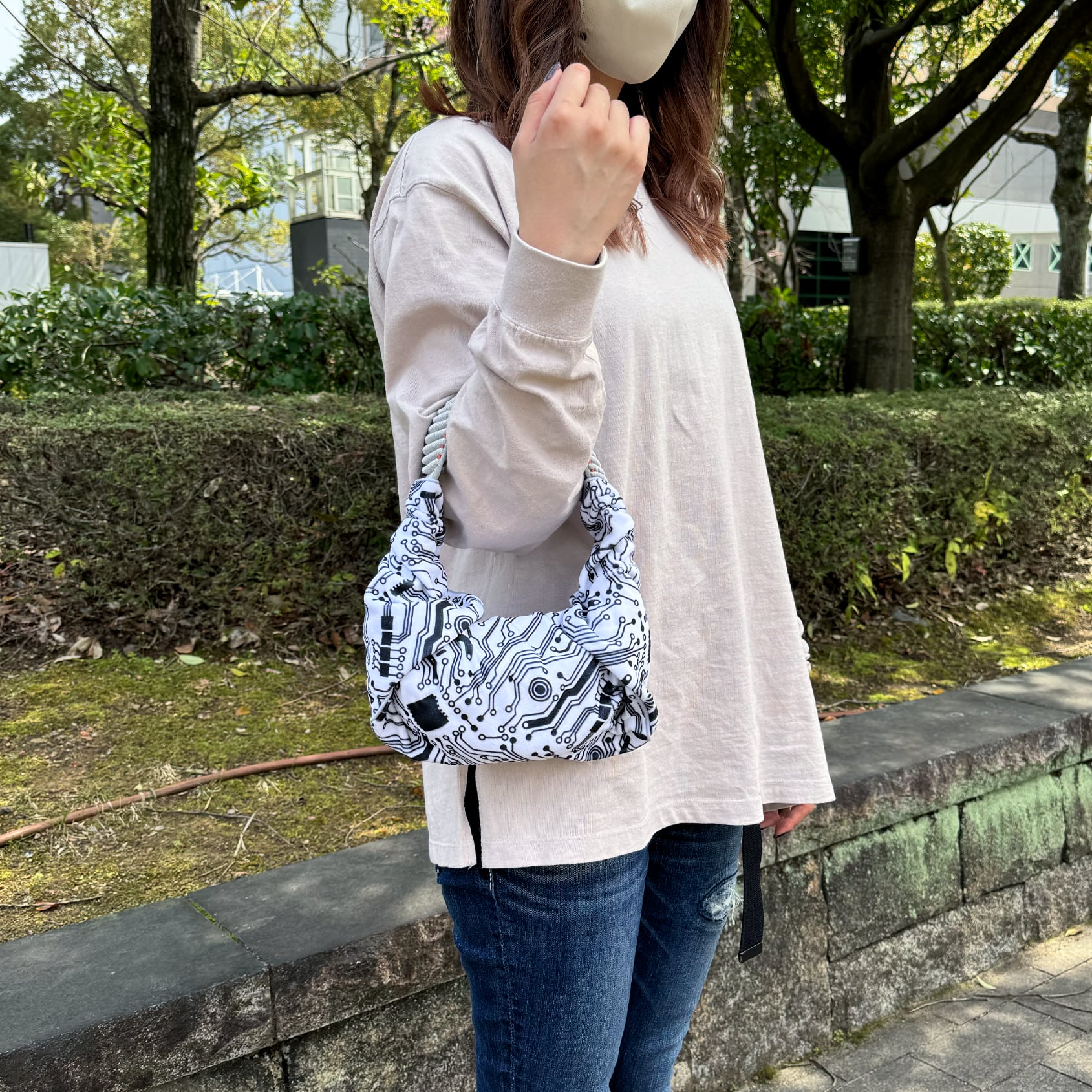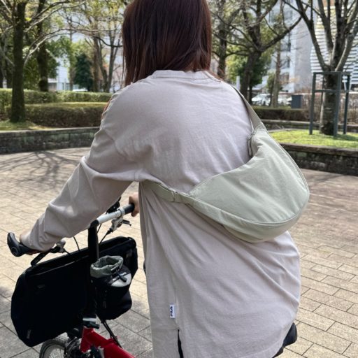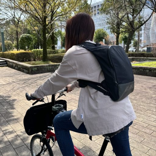 このバッグで自転車に乗るには斜めがけして、背中の中央に固定されるようにショルダーを短く締め上げる。そう、メッセンジャー・バッグの要領だ。安全のためにバッグのジッパーは閉じておくのが良いだろう。その際にヘッドバンドの側頭部は曲げにくいので慎重に扱おう。ともあれ、このシンプルで慎ましいバッグはミレニアム世代のバーキンであり、デジタル世代のハッシュ・バッグだ。