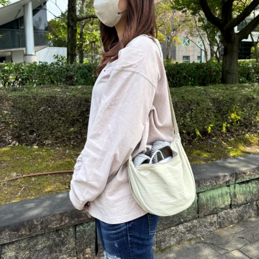 小型軽量で大容量となればユニクロのラウンド・ミニ・ショルダー・バッグは外せない。これにApple Vision Proがピッタリ収まる。半円形で底面が広がる形状はApple Vision Proのためにデザインされたとしか思えない。クロスで包むと入りにくいので、Apple Vision Proをそのまま入れる。上部のジッパーを開けたまま肩がけして歩き、必要となればさっと取り出すのが楽しい。
