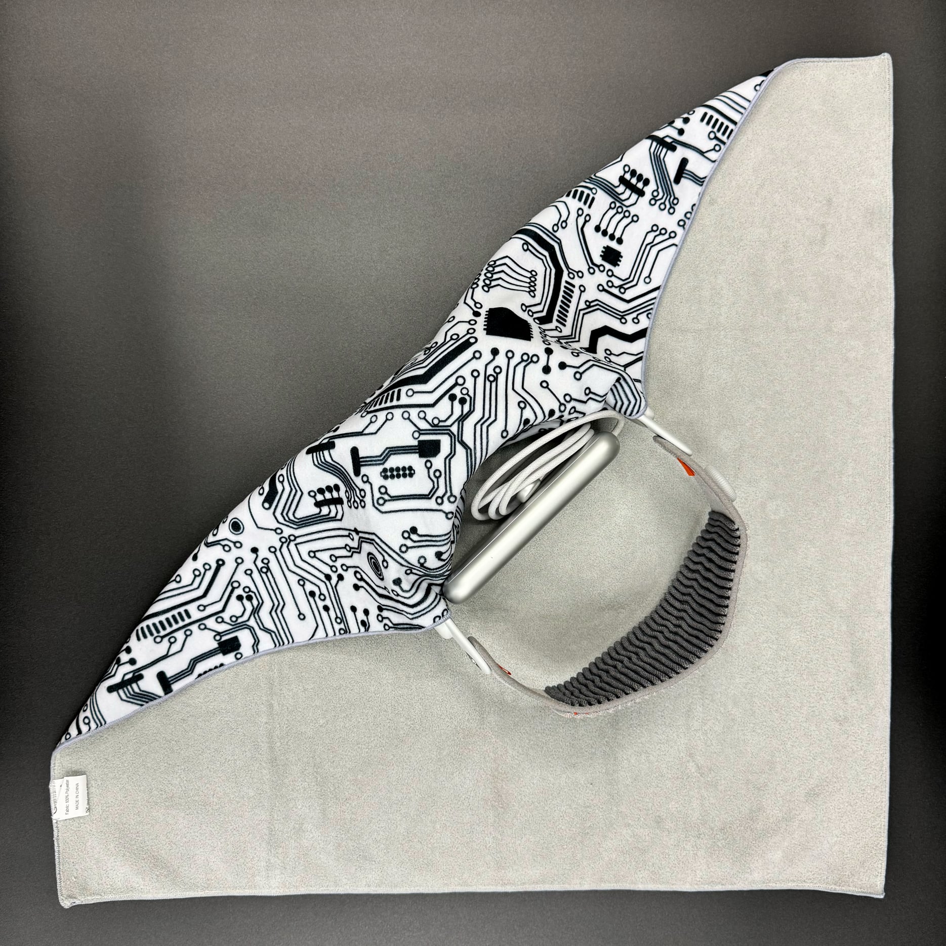 できるだけコンパクトなケースを考えると、その最適解はカメラ用のラッピング・クロスであった。ちょうど風呂敷のようにバッテリーごとApple Vision Proを包み込むことができる。クロス自体で前面ガラスについた指紋などの汚れも拭えるのも良い。ヘッドバンドの後頭部が露出するので、これが持ち手になる。肘や小脇に抱えればハイブランドのハンドバッグのよう…とは言い過ぎ。