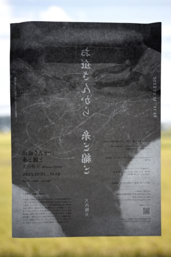 大西暢夫の「お蚕さんから糸と綿と」春日森の文化博物館(2023)では、厚さ0.05mmの薄い用紙を用いた両面刷りのフライヤーとなっている。手に取って持ち上げると、黒い背景に抜かれたタイトルが裏面からも透けて見える。絹のような繊細な軽やかさを表現している。
