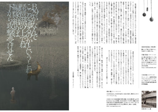 柴田慶子の「言葉が見せる風景」春日森の文化博物館(2023)では、村人の語りを一字一字、可読ギリギリの間隔で繋いでいる。文字がイメージと重なり、記憶の風化によって時間と共に同化していく様子を感じさせる。