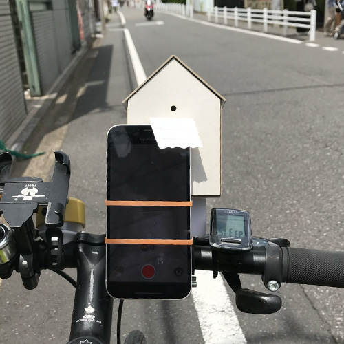 スマホというテクノロジーを用いる意義を考えた結果、スマホのインカメラによって普及した自撮りに着目することにした。自撮りは自身の姿を鏡のように映し出すというよりも、盛って撮る。この、自分を理想の形に演出しながら撮影する行為の対比として本作を提示することにした。スマホを用いて空間を一方向から映像として記録すると、視点は固定されているから空間の形状が常に明確になる。そこへ映像が投影されるため、空間が額縁のように認識される。360°カメラからスマホに持ち替え、自撮りと結びつけ、家という住まいの象徴に自転車を漕いでいる自己を投影することで本作はセルフポートレートとしての性質を強めた。