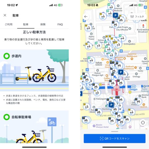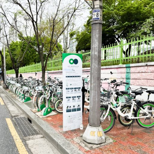 Bromptonがあるので必要ではないが、シェアリング自転車も試してみようと思った。以前からある白に緑のタルンイはソウル市による公共サービスで、電動アシストではないものの子供用の小型車もあるのが優れている。近くのポート(駐輪場、ステーション)で借りて、移動した先のポートで返却することになる。再配置作業が遅いのか、駐輪設備から自転車が溢れていることが多い。