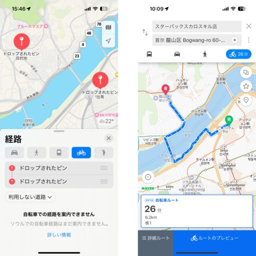 ところで、GoogleマップやAppleマップは機能が制限されていて、自転車ルート検索やiPhoneやAirTagを探す(Find My)なども使えない。韓国での位置情報はNaverマップなど国内サービスが主流。これは自国産業を保護するとともに、北朝鮮との戦争状態にある韓国では国外への位置情報送信を禁止しているからだそうだ。情報のグローバリズムと日本でのセキュリティを考えさせられる。