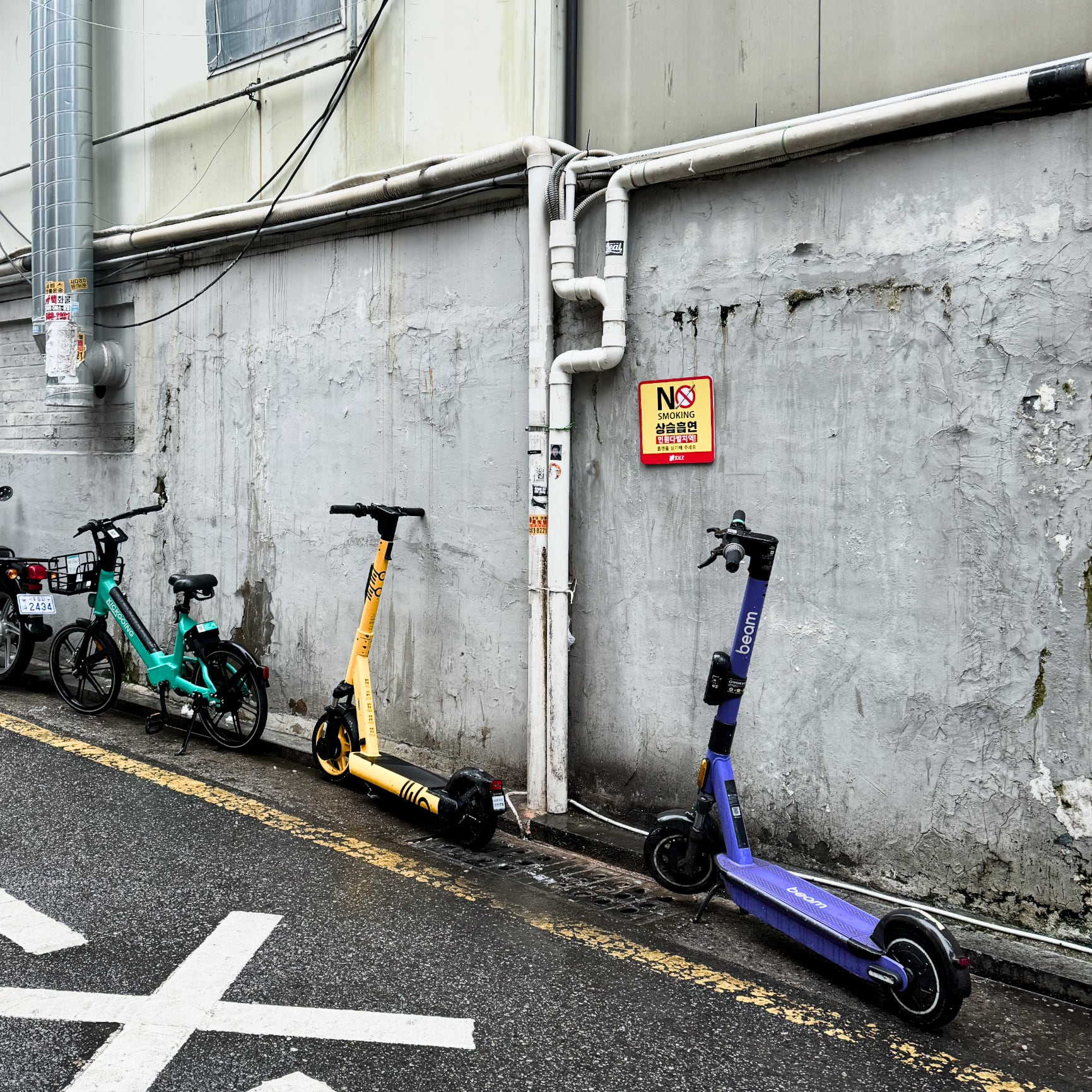 また、民間運営のシェアリングは電動アシスト自転車や電動キックボードで、どこにでも置けるポートレス型。ポートまで行く手間がないので利便性は高い。緑に黒のGCOO、黒に黄色のKakao、赤いelecleなど色とりどりの自転車が街中至るところに溢れている。電動なのでバッテリー交換や再配置は行われているものの、道路の公共性や安全性を損なっているとの批判も強いらしい。