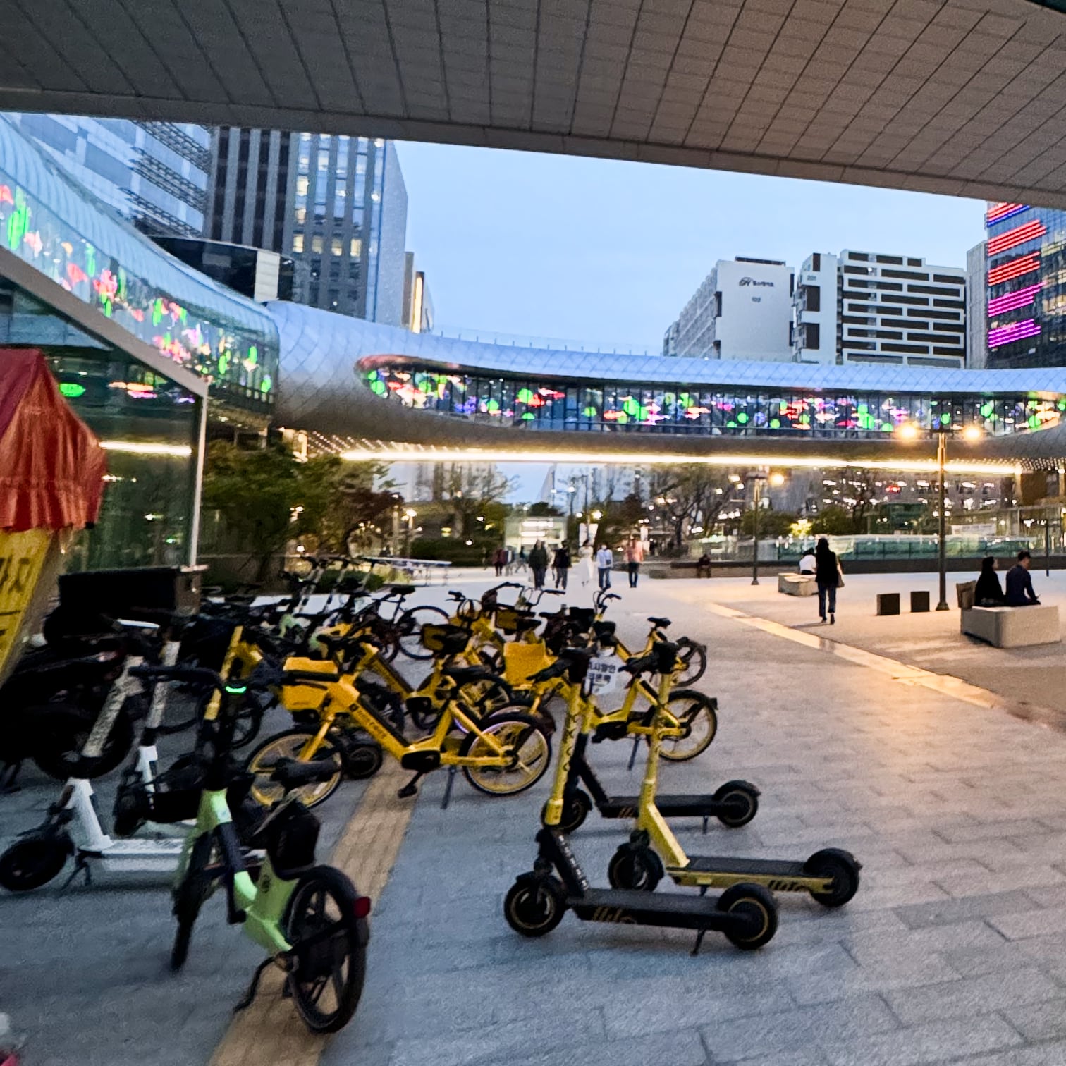 このように韓国では自転車シェアリングが盛んな様子が伺えた。トップ・ランナーは中国で、その後を韓国が追いかけている状況だろうか。規制が厳しく、保守的な日本は遥か後塵を拝している。しかもヘルメットなしの電動キックボードなど間違った模倣ばかりが目立つ。共有や分散などは現代社会の在り方を問う先端的(エッジ)な取り組みなので、今後も注目していきたい。