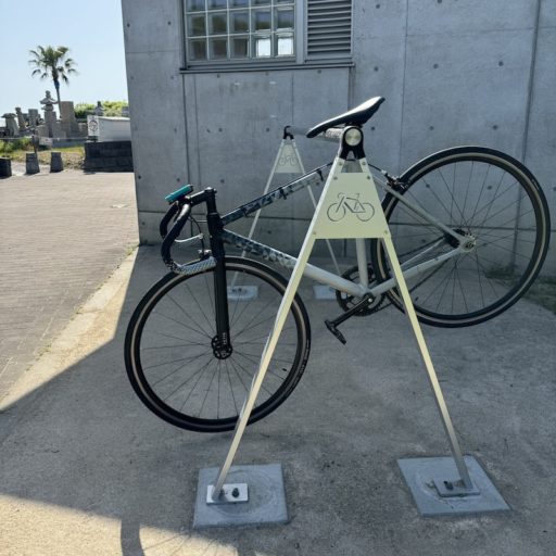 この横線の道を走る自転車は多種多様である。それは目的地が多種多様である上に、このサイクリングロード上のどこにも目的地はない。目的地と目的地の間にこの横線を組み込んでつないでいる。その横線の上にある砂浜、コーヒースタンド、ウィンドサーフィン練習場、漁港、ハンバーガー店、公園、カフェ、神社の鳥居・・・、これらはみな縦にやってくる人たちの目的地ではあるが、サドルハンガーが備わっている場所はあまりみかけない。