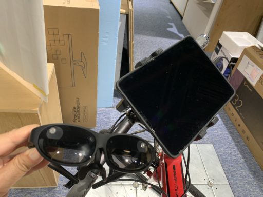 前回の自転車のハンドルにiPhoneを固定して小説を読むAR版プロトタイプの制作において体験者の身体とデバイスが密着していることが文字の視認性を向上させる必須条件であることが分かりARグラスの採用を決めた。その矢先に本研究がARグラスを販売するXREAL社の「ARコンテンツ推進プログラム」に採択されたこともあり、ARグラスとしてXREAL Lightを、ソフトウェア(AR)の起動にはiPadを利用して開発を進めている。