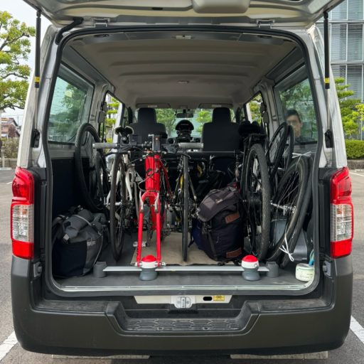 今回の参加者は筆者を含めて4人で、途中休憩しながらバンで6時間ほどかけて福井県は志賀町の宿に入る。各自の自転車は3台用と2台用のサイクル・ラックを組み合わせて車載。前輪を付け外しする手間はあるものの、クイック・リリースやスルー・アクスルでの固定は安定している。ライド中はバンが並走するので、運転手交代時の自転車の積み下ろしも簡単。タイヤがパンクした際も対応が楽だった。