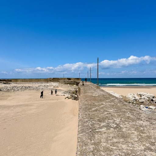 その後は北上して起伏がある山間部と滑らかな海岸線を走り抜ける。天候良く風も穏やかで、山の緑や海の青が美しい。巌門やトトロ岩などの奇岩が日本海の荒波を伝えている。やがて道路脇の堤防から海岸線が離れ、不自然な様相を呈する。地震で海底が3〜4メートルも隆起したからだ。完全に干上がった黒島漁港には白く乾燥した海藻が付着する岩が露呈し、遠くまで砂浜が続いている。かつての海底だ。