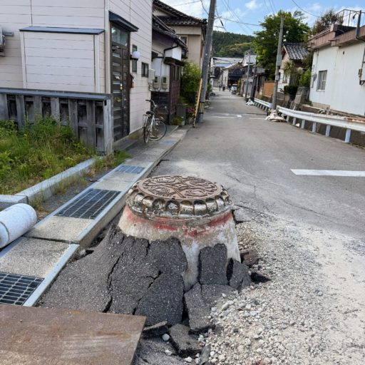 こうして辿り着いた輪島の市街地は地方小都市らしい建物が立ち並ぶ。ここでは特に被害の差が激しいのが印象的。平坦な道路から数十センチもマンホールが飛び出していたり、平穏な街並みの一角が倒壊して道を塞いでいたりする。地震直後に火災が発生した朝市は、瓦礫の焼け野原が区画として際立っている。また、海岸沿いは山崩れで道路が分断されており、港には海底隆起で出港できない漁船が並んでいる。