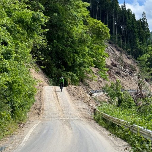 実際の道路状況は路肩の崩落、路面のヒビ割れ、応急措置の段差などが続き、道幅が狭いことも相まって走行環境は劣悪だ。特に県道51号は土砂崩れがひどく、撤去されていない土砂を乗り越える箇所もある。また道路標識も不十分であり、古い注意書きが残されたままだったりする。Garmin Edgeのルート案内が柔軟ではないので、実際にも曲がり角を間違えたのは冷や汗もの。