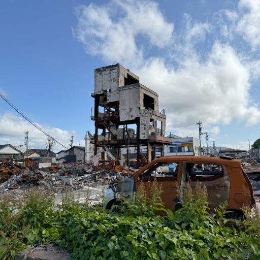翌朝は宿を出発して輪島の中心部を目指す。まずは志賀原子力発電所。日本で最初の臨界事故を起こして隠蔽して以来、幾多のトラブルを重ねている。2011年の福島第一原子力発電所のメルトダウンと前後して運転を停止していたものの、危険な使用済み核燃料が大量に残っている。今回の地震では被害はなかったのは幸運だったと言うべきだろうか。道路から間近に白白と建屋が見える。