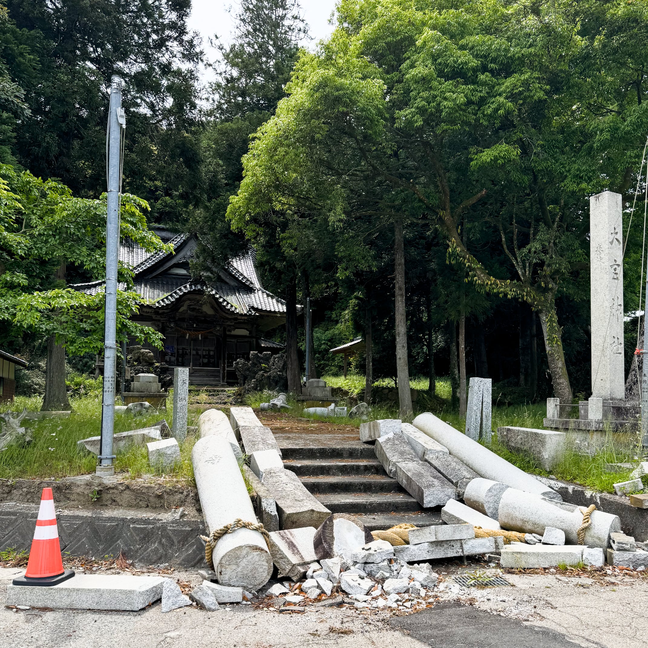 早めの昼食後は島の中央北側の向田漁港の駐車場にバンを停め、自転車を降ろして走り出す。舗装道路はひび割れたり、簡易舗装されていたりするものの、走行が困難というほどではない。山間の緑や海辺の青が心良く、遠く微かに立山連峰が見えたりもする。穏やかな農村や漁村の風景に被災地であることを忘れそうになる。だが、突然に大きな石の鳥居の崩壊に出くわしたりする。