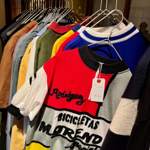さすがに京都駅は混沌とした混雑ぶりで、先が思いやられる。しかし、少し歩くと落ち着いた雰囲気になる。案内されたのは近くの町屋カフェ。最初にコーヒーをいただくのはサイクリストの掟。ただし、砂糖たっぷりのエスプレッソではなく無糖のカフェ・オレ。奥のショップには古着のジャージもある。最近の京都事情から今日の周遊ポリシーまで暫し雑談。